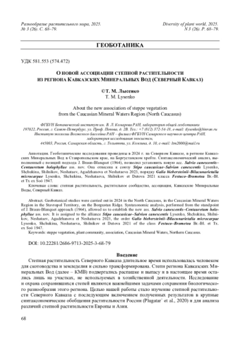 Степная растительность Северного Кавказа длительное время использовалась человеком для скотоводства и земледелия и сильно трансформирована. Степи региона Кавказских Минеральных Вод (далее – КМВ) подвергались распашке и выпасу и в настоящее время оста-лись лишь на участках, не используемых в хозяйственной деятельности. Исследование и охрана сохранившихся степей являются важнейшими задачами сохранения биологического разнообразия этого региона. Целью нашей работы стало изучение степной растительно-сти Северного Кавказа с последующим включением полученных результатов в крупные синтаксономические обобщения растительности России (Plugatar` et al., 2020) и для анализа различий степной растительности Европы и Азии.
