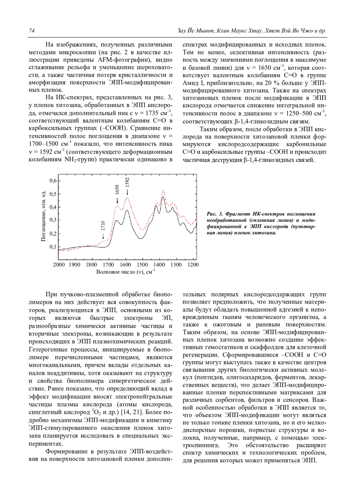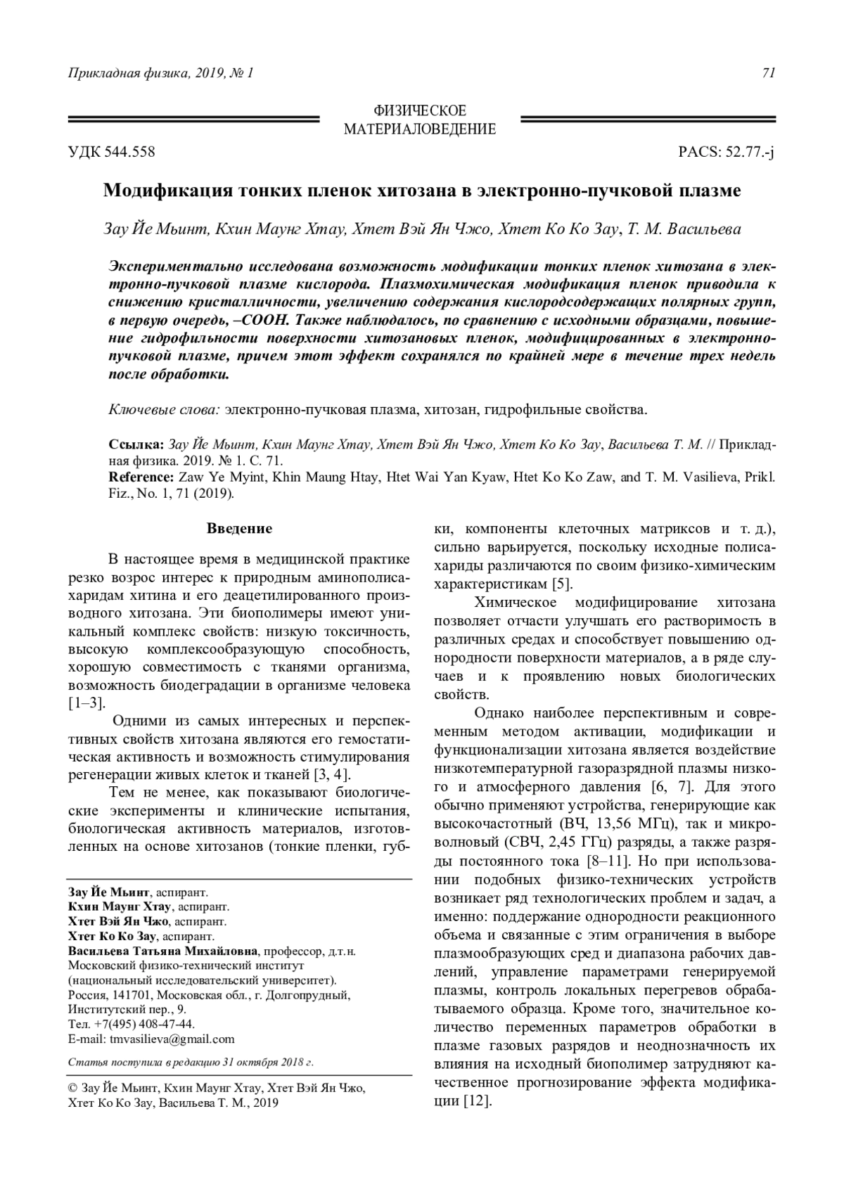 Зау Йе Мьинт, Кхин Маунг Хтау, Хтет Вэй Ян Чжо, Хтет Ко Ко Зау, Васильева Т. М. Модификация тонких пленок хитозана в электронно-пучковой плазме 71