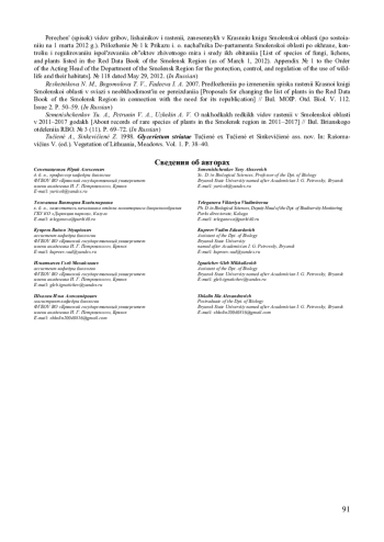 5. Решетникова Н. М., Богомолова Т. В., Фадеева И. А. 2007. Предложения по изменению списка растений Красной книги Смоленской области в связи с необходимостью её переиздания // Бюл. МОИП. Отд. Биол. Т. 112. Вып. 2. С. 50-59.