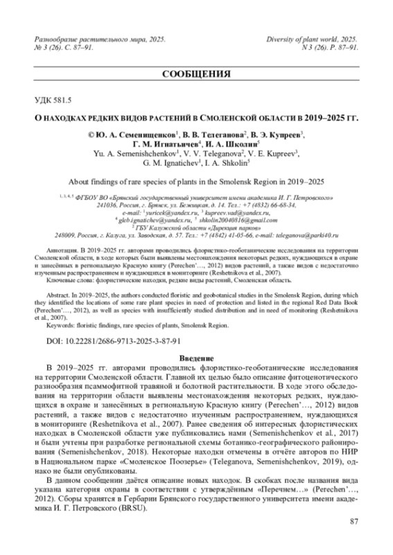 В 2019–2025 гг. авторами проводились флористико-геоботанические исследования на территории Смоленской области, в ходе которых были выявлены местонахождения некоторых редких, нуждающихся в охране и занесённых в региональную Красную книгу (Perechen’…, 2012) видов растений, а также видов с недостаточно изученным распространением и нуждающихся в мониторинге (Reshetnikova et al., 2007).