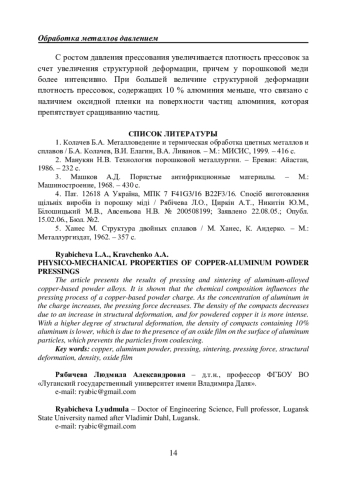 В статье представлены результаты прессования и спекания порошковых сплавов на основе меди легированных алюминием. Показано, что на процесс прессования порошковой шихты на основе меди влияет химический состав. С увеличением концентрации алюминия в шихте сила прессования уменьшается. Плотность прессовок уменьшается за счет увеличения структурной деформации, причем у порошковой меди более интенсивно. При большей величине структурной деформации плотность прессовок, содержащих 10 % алюминия меньше, что связано с наличием оксидной пленки на поверхности частиц алюминия, которая препятствует сращиванию частиц.