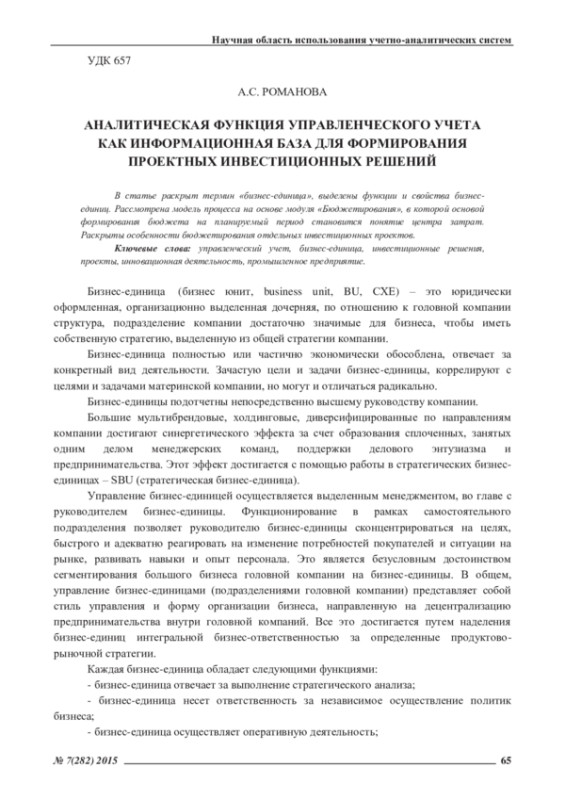 В статье раскрыт термин «бизнес-единица», выделены функции и свойства бизнесединиц. Рассмотрена модель процесса на основе модуля «Бюджетирования», в которой основой формирования бюджета на планируемый период становится понятие центра затрат. Раскрыты особенности бюджетирования отдельных инвестиционных проектов
