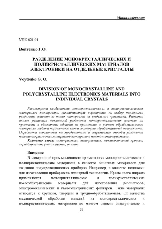 Рассмотрены особенности монокристаллических и поликристаллических материалов электроники, накладывающие ограничения на выбор технологии разделения пластин из таких материалов на отдельные кристаллы. Выполнен анализ различных технологий разделения монокристаллических пластин на кристаллы и обозначены области их применения с учетом обрабатываемого материала, глубины нарушенного слоя и геометрии обрабатываемой поверхности. Определены ограничения на традиционные и современные способы разделения пластин из различных материалов электроники на отдельные кристаллы.