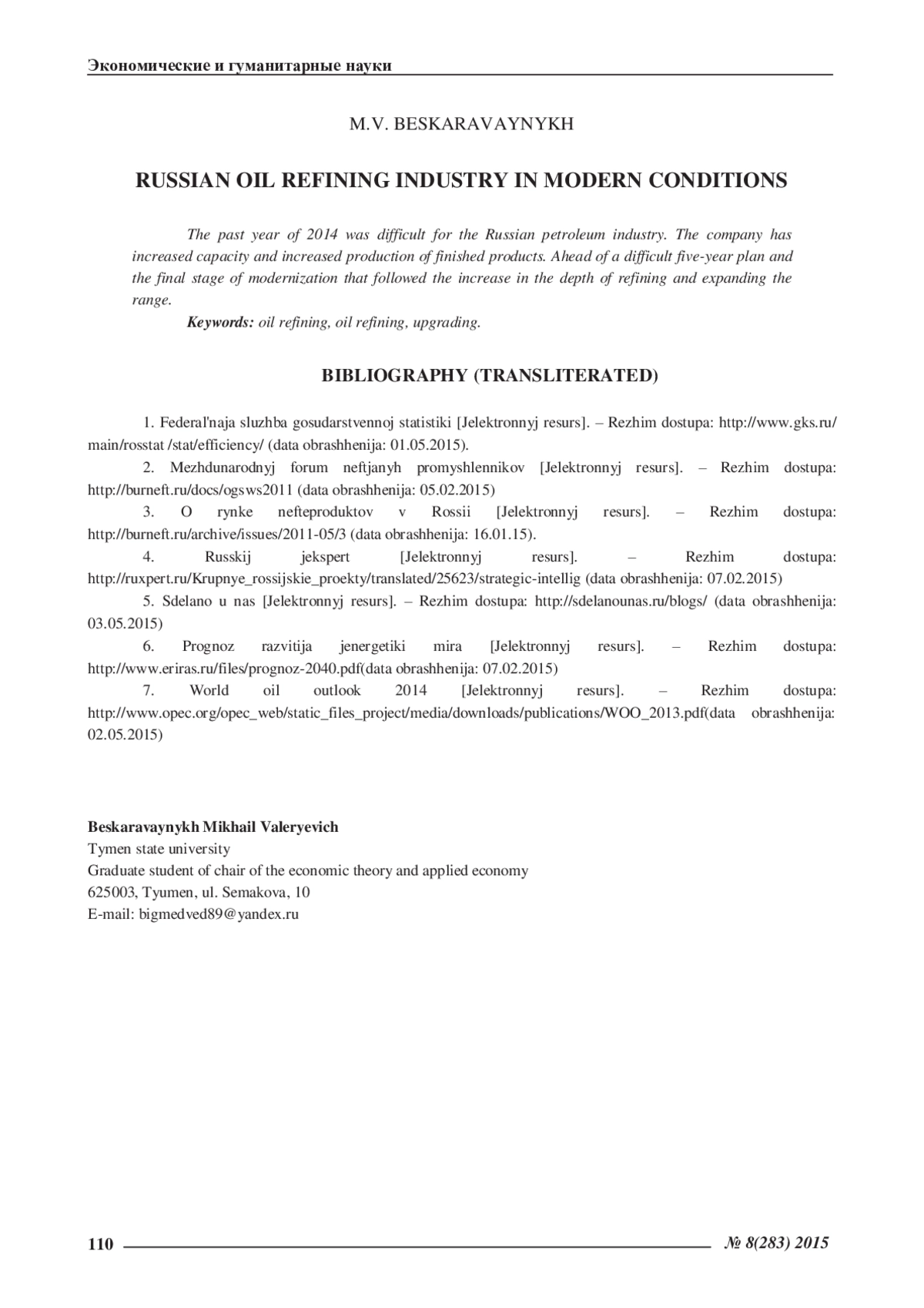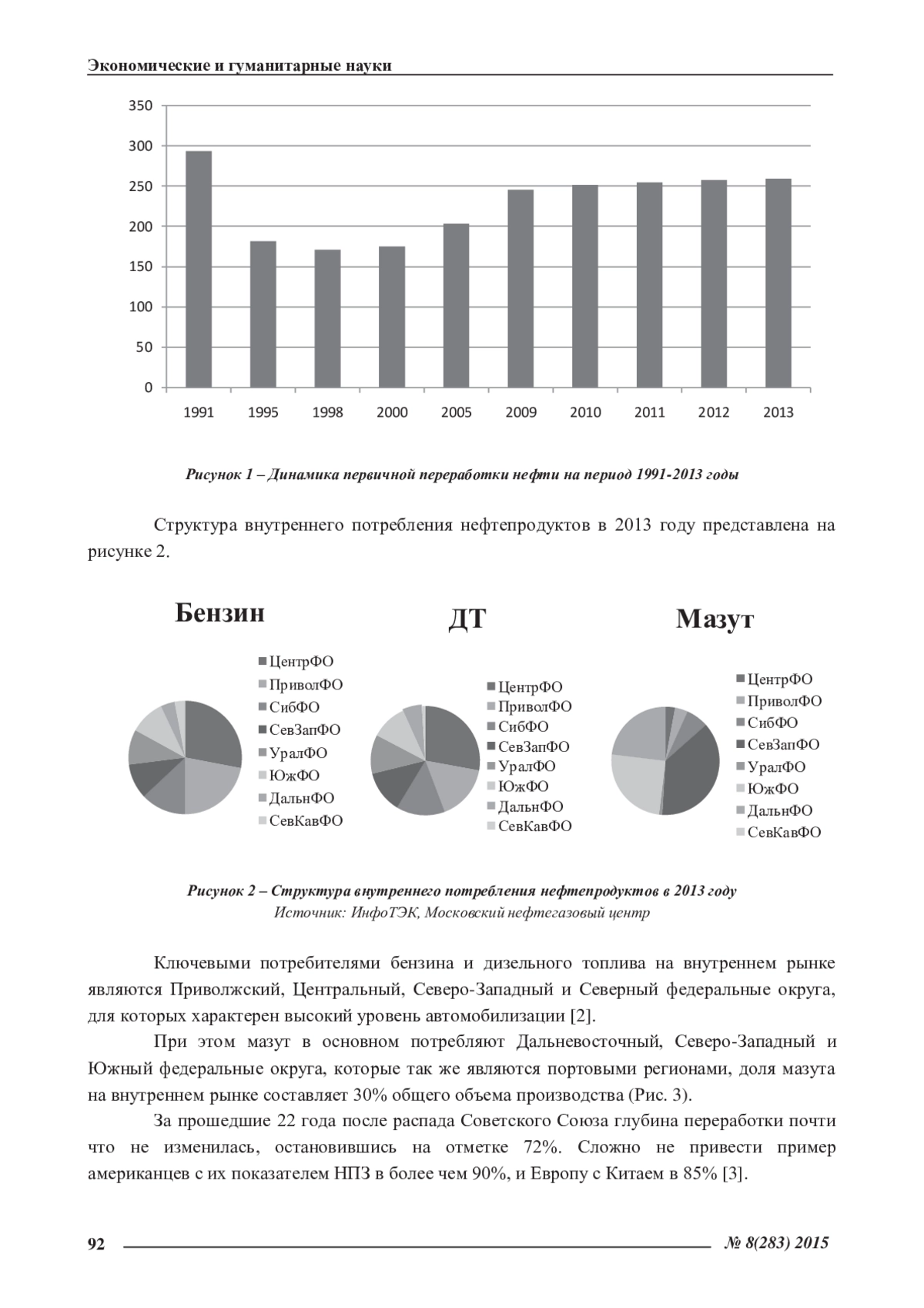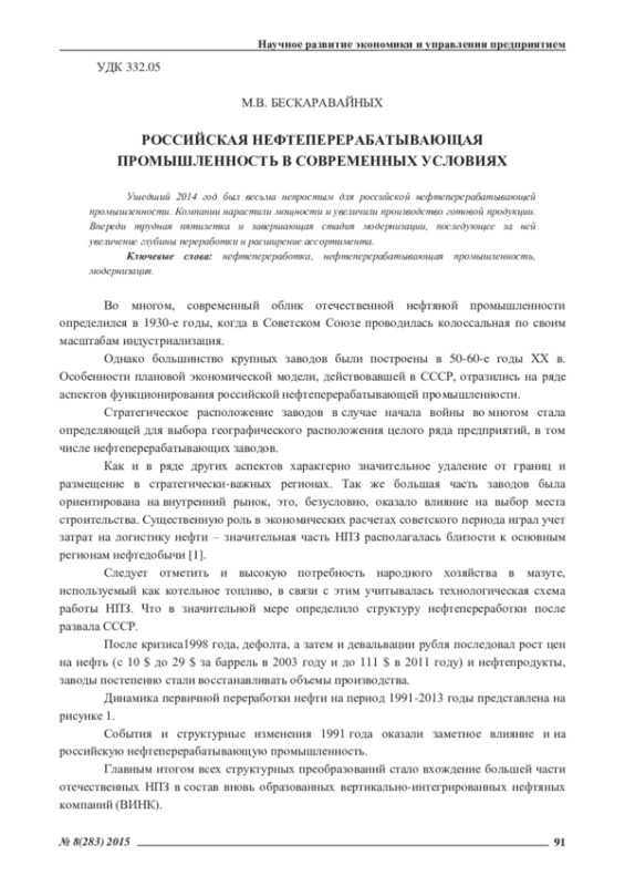 БЕСКАРАВАЙНЫХ М. В. РОССИЙСКАЯ НЕФТЕПЕРЕРАБАТЫВАЮЩАЯ ПРОМЫШЛЕННОСТЬ В СОВРЕМЕННЫХ УСЛОВИЯХ // ЭКОНОМИЧЕСКИЕ И ГУМАНИТАРНЫЕ НАУКИ. 2015. № 8 (283)