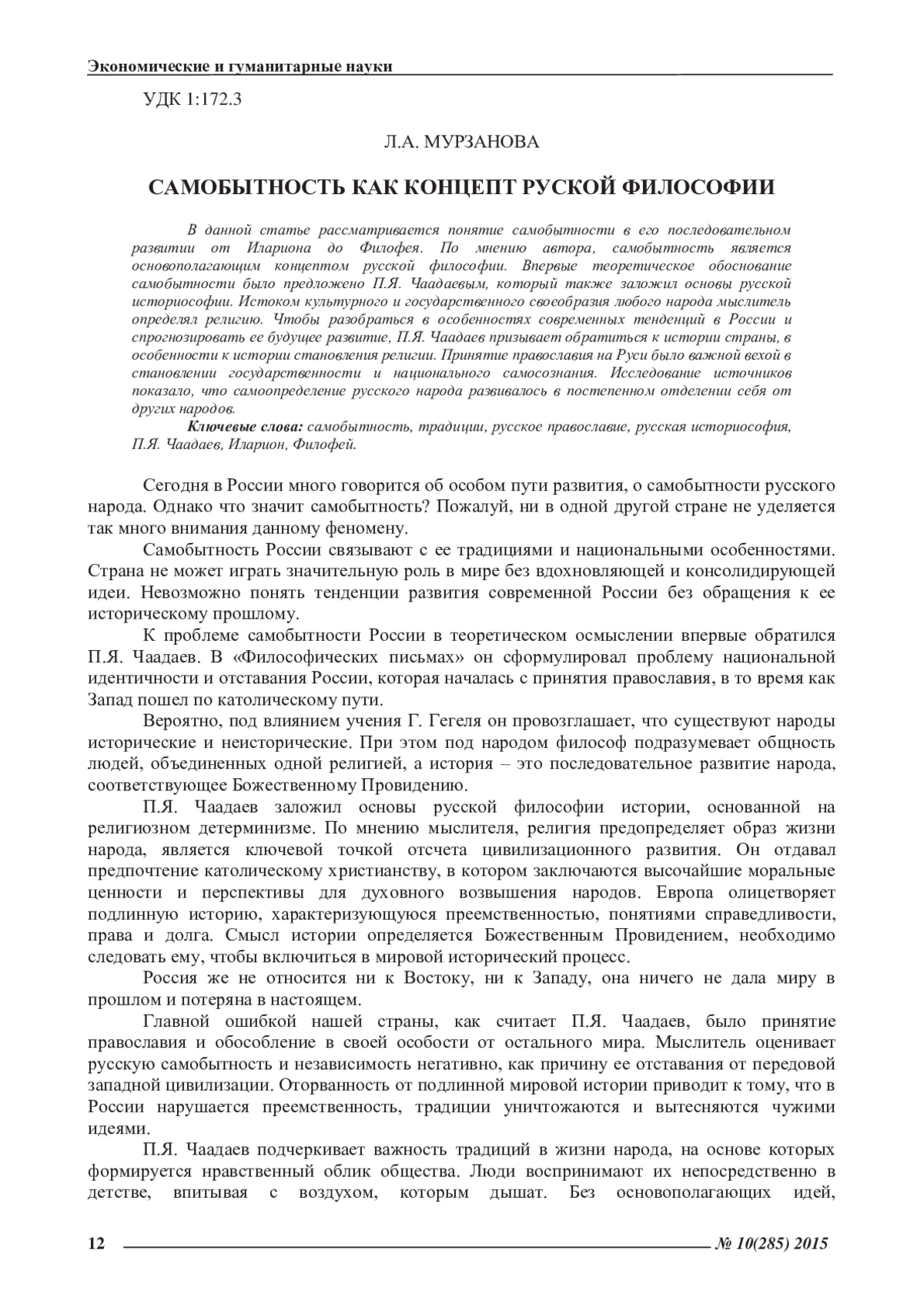 В данной статье рассматривается понятие самобытности в его последовательном развитии от Илариона до Филофея. По мнению автора, самобытность является основополагающим концептом русской философии. Впервые теоретическое обоснование самобытности было предложено П. Я. Чаадаевым, который также заложил основы русской историософии. Истоком культурного и государственного своеобразия любого народа мыслитель определял религию. Чтобы разобраться в особенностях современных тенденций в России и спрогнозировать ее будущее развитие, П. Я. Чаадаев призывает обратиться к истории страны, в особенности к истории становления религии. Принятие православия на Руси было важной вехой в становлении государственности и национального самосознания. Исследование источников показало, что самоопределение русского народа развивалось в постепенном отделении себя от других народов