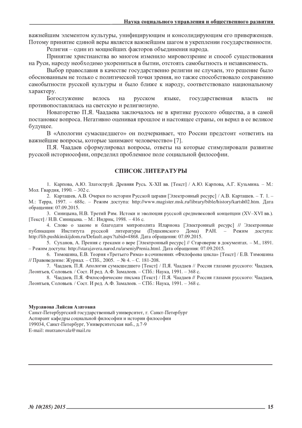 7. Чаадаев, П.Я. Апология сумасшедшего /П.Я. Чаадаев//Россия глазами русского: Чаадаев, Леонтьев, Соловьев./Сост. И ред. А.Ф. Замалеев. -СПб.: Наука, 1991. -368 с.
