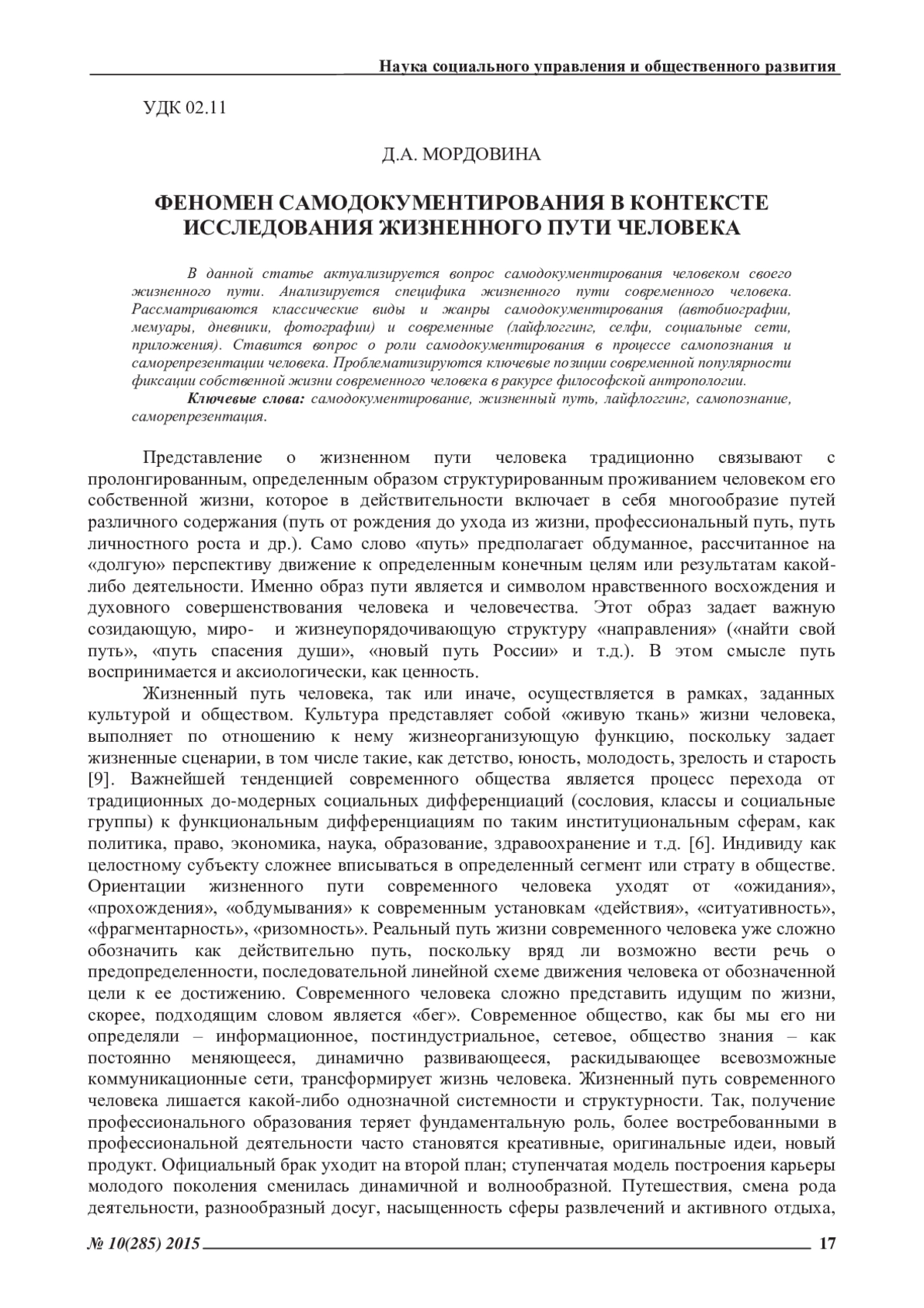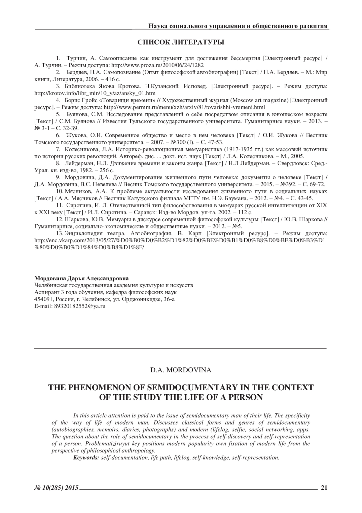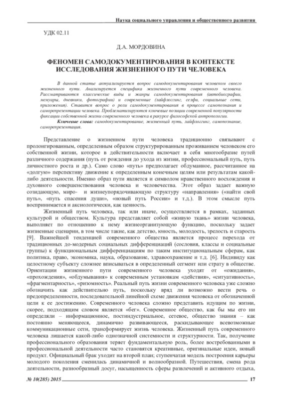 МОРДОВИНА Д. М. ФЕНОМЕН САМОДОКУМЕНТИРОВАНИЯ В КОНТЕКСТЕ ИССЛЕДОВАНИЯ ЖИЗНЕННОГО ПУТИ ЧЕЛОВЕКА // ЭКОНОМИЧЕСКИЕ И ГУМАНИТАРНЫЕ НАУКИ. 2015. № 10 (285)