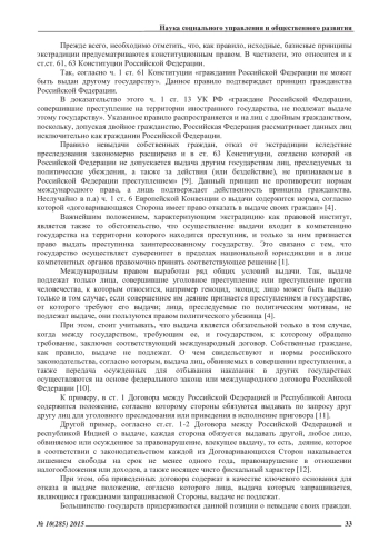 Процесс формирования международных отношений как неотъемлемой части современного международного права предполагает постоянное совершенствование сотрудничества государств, в том числе, при осуществлении правовой взаимопомощи в борьбе с международными преступлениями и преступлениями международного характера. Международная практика свидетельствует, что одним из действенных правовых средств, используемых в борьбе с преступностью, является институт экстрадиции, который предполагает выдачу лиц, совершивших преступление