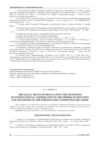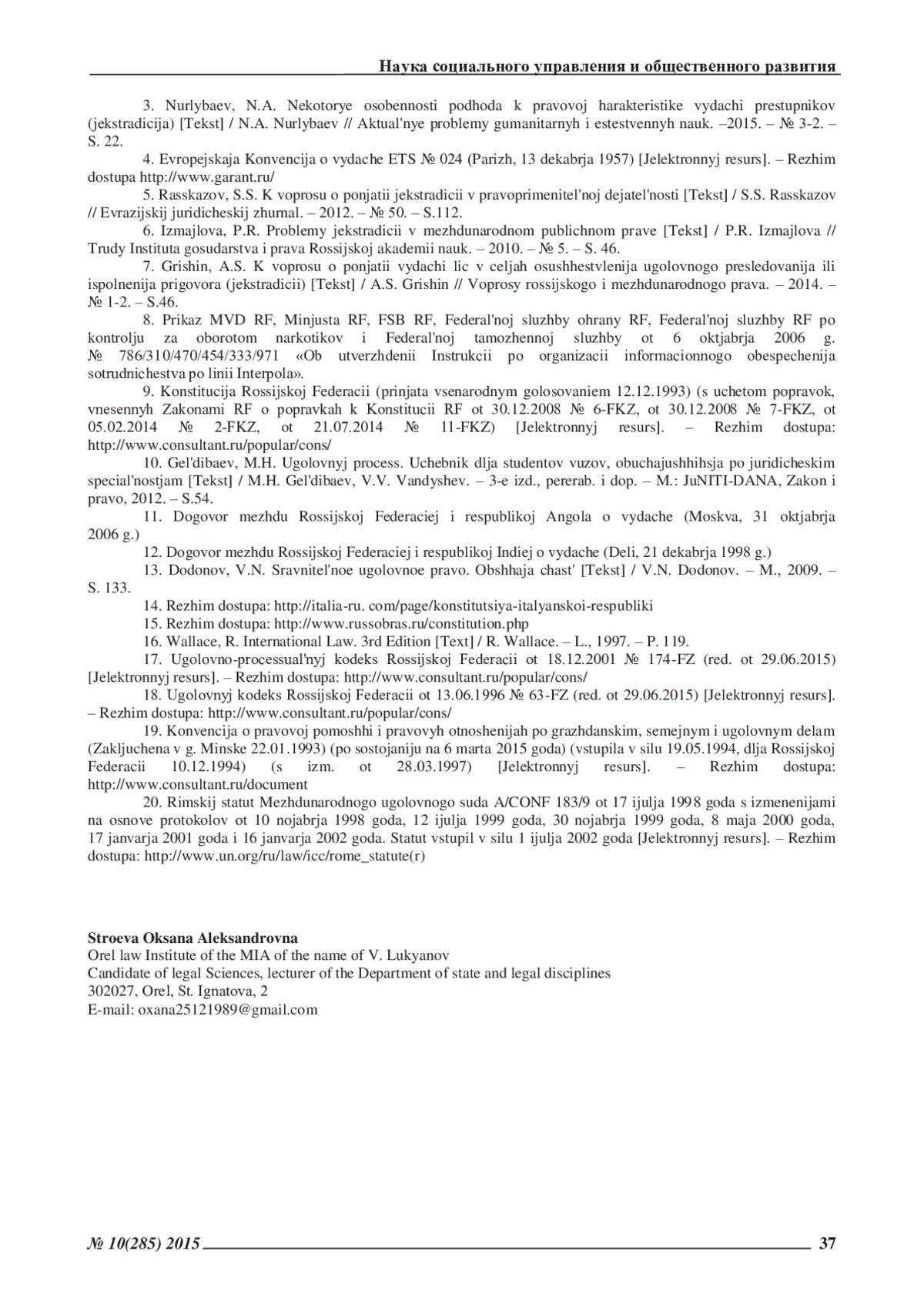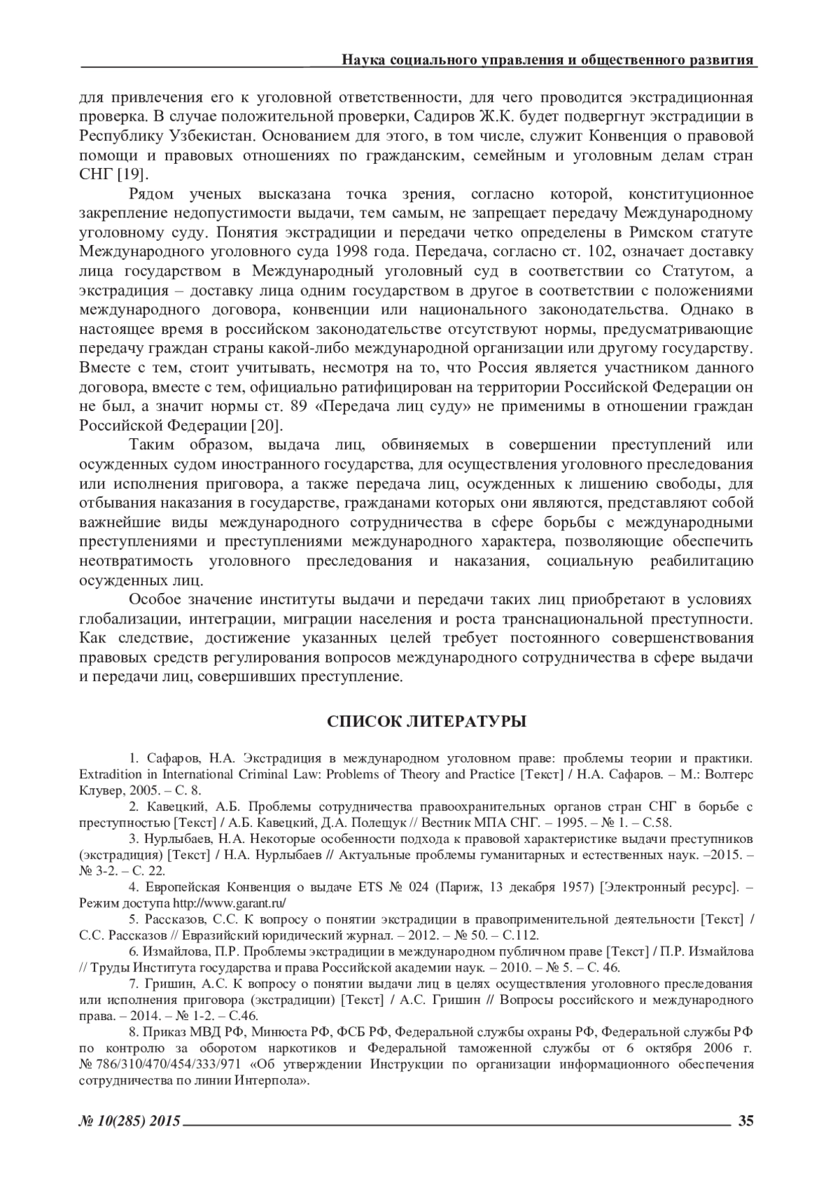 6. Измайлова, П.Р. Проблемы экстрадиции в международном публичном праве [Текст] / П.Р. Измайлова // Труды Института государства и права Российской академии наук. - 2010. - № 5. - С. 46. EDN: TXTZXP
