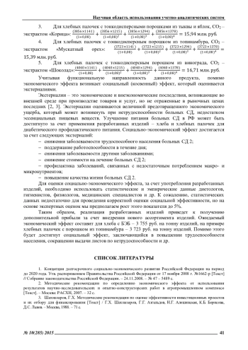 В статье приведены расчѐты экономического эффекта от внедрения новых видов хлебобулочных изделий для диабетического профилактического питания по Нижегородской области, себестоимости изготовления данных изделий. Авторы отмечают также и социальный эффект, заключающийся в повышении трудоспособности населения, сокращении выдачи листов по нетрудоспособности, профилактики заболеваний, связанных с недостаточным потреблением макро- и микронутриентов и повышение качества жизни больных сахарным диабетом второго типа.