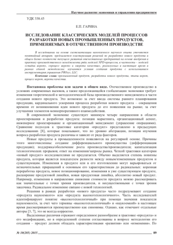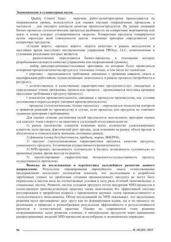 В исследовании на основе систематизации накопленного научного опыта уточняется понятийный аппарат; предлагается кластеризация решений по разработке нового продукта в общем бизнес-контексте текущего развития отечественных предприятий на основе внедрения в практику производственного менеджмента ряда моделей NPD-процессов, в частности – моделей «стадии ворот», «процесс ворот» и «ворота качества», реализуемых в настоящее время в рамках единой методологии; изучаются условия создания продукта с использованием инструментария управления PROsys, LLC