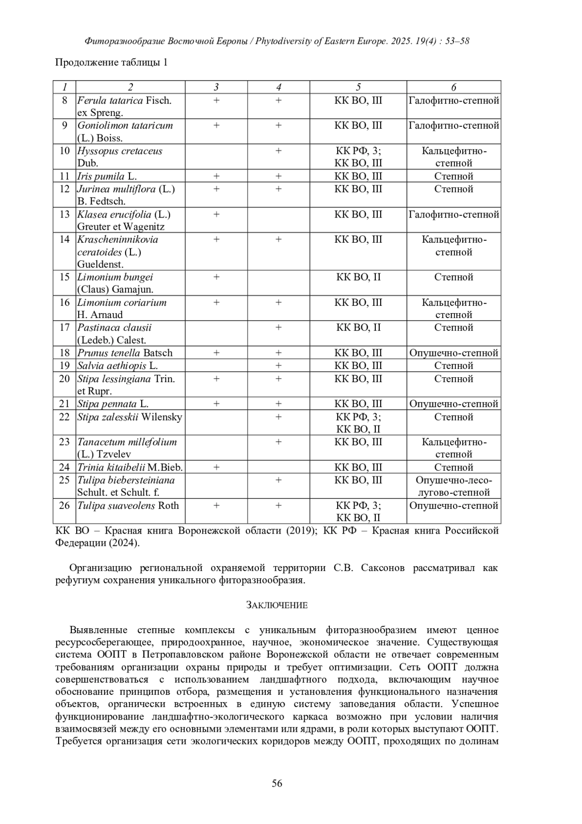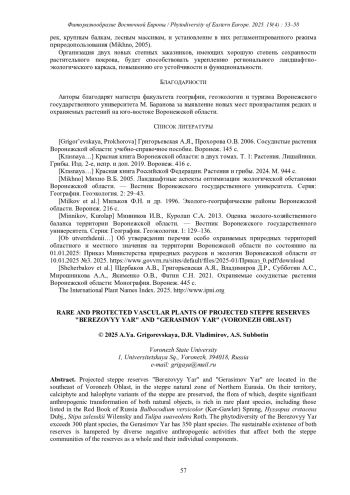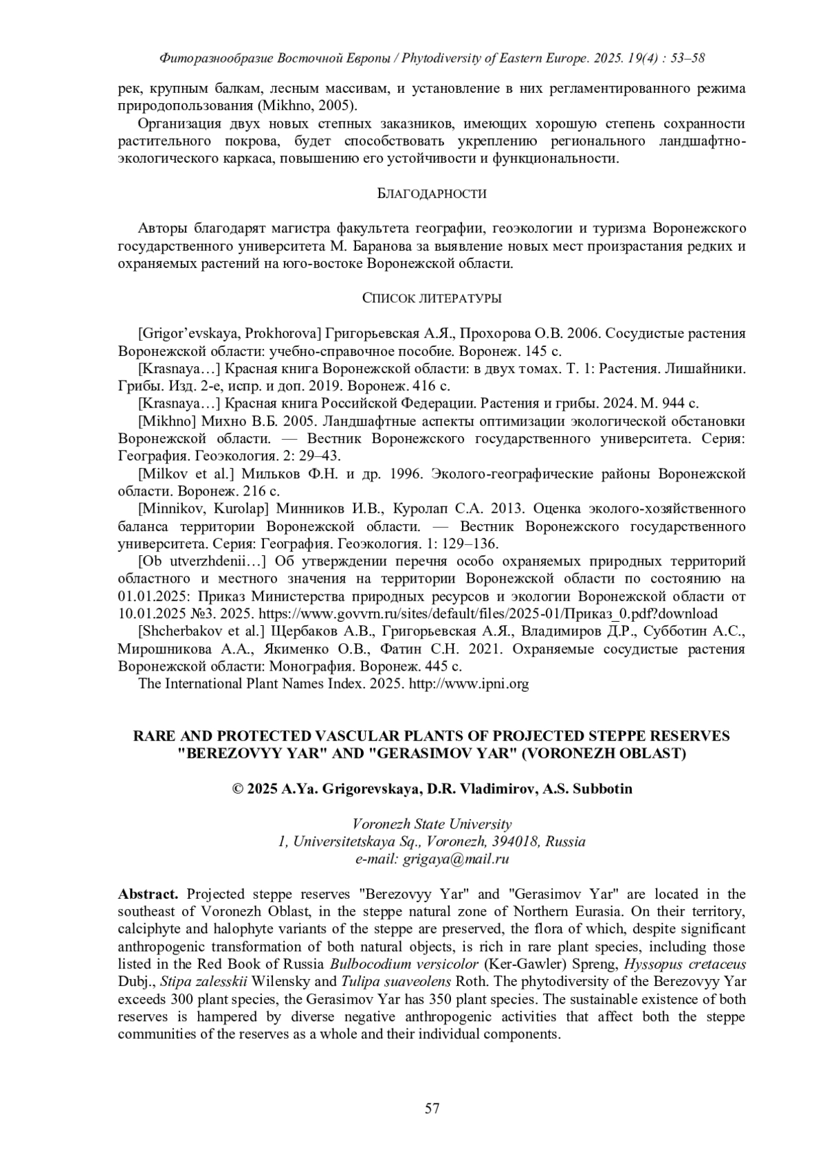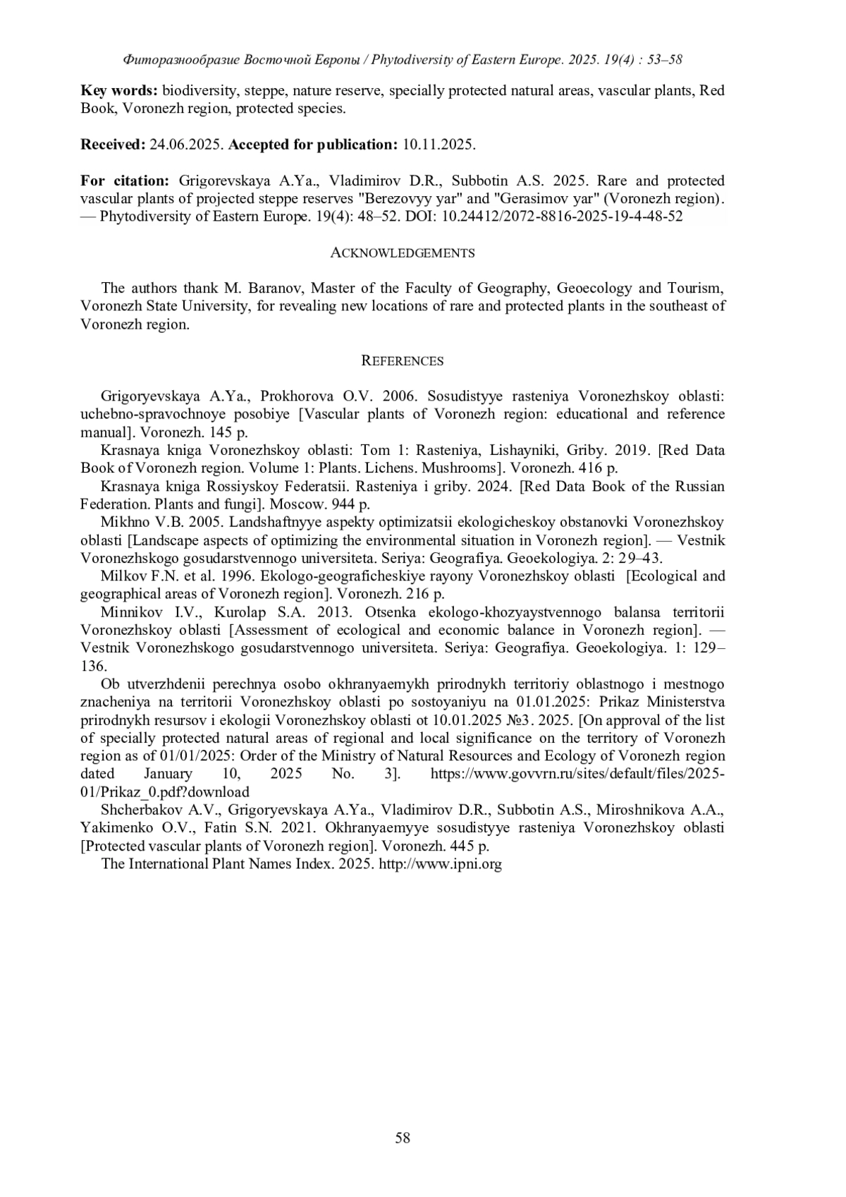 8. [Shcherbakov et al.] Щербаков А.В., Григорьевская А.Я., Владимиров Д.Р., Субботин А.С., Мирошникова А.А., Якименко О.В., Фатин С.Н. 2021. Охраняемые сосудистые растения Воронежской области: Монография. Воронеж. 445 с. EDN: KAOOYP