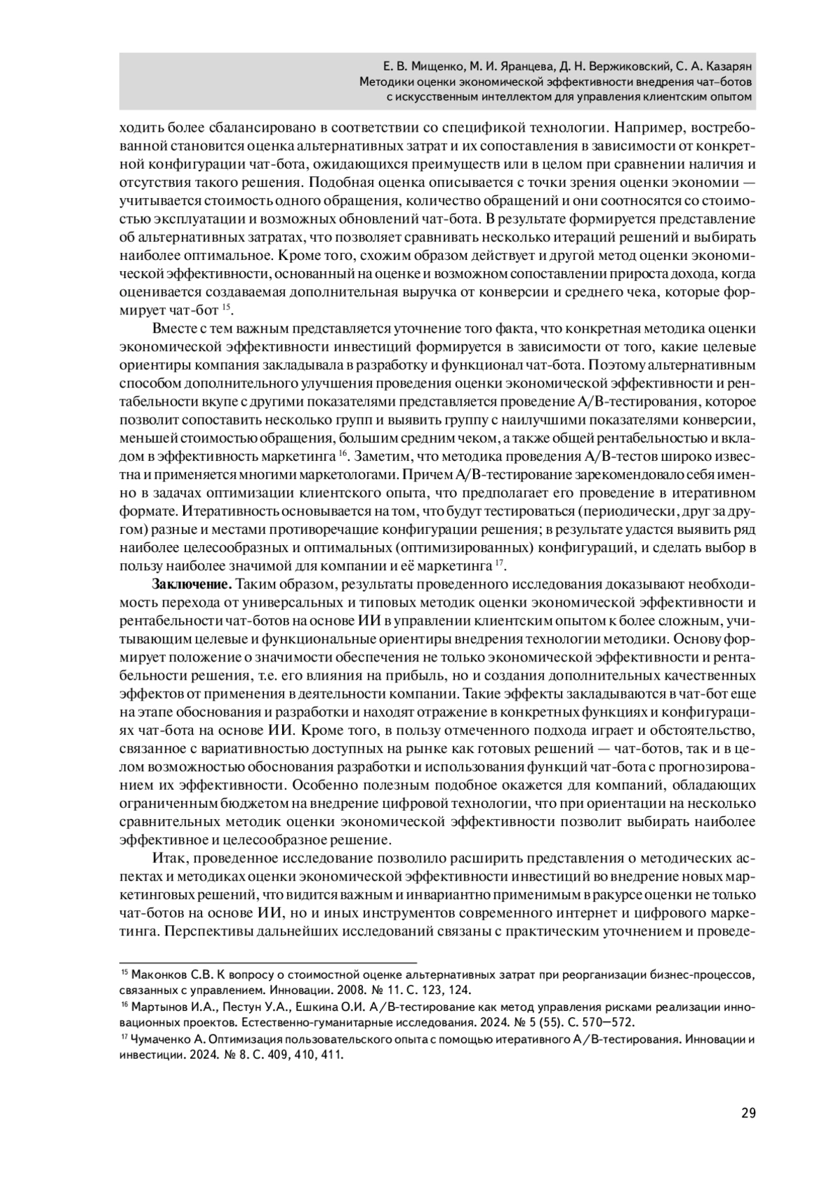 Цель исследования — обобщить теоретические аспекты применения чат–ботов в управлении клиентским опытом и методики оценки экономической эффективности инвестиций в них.
