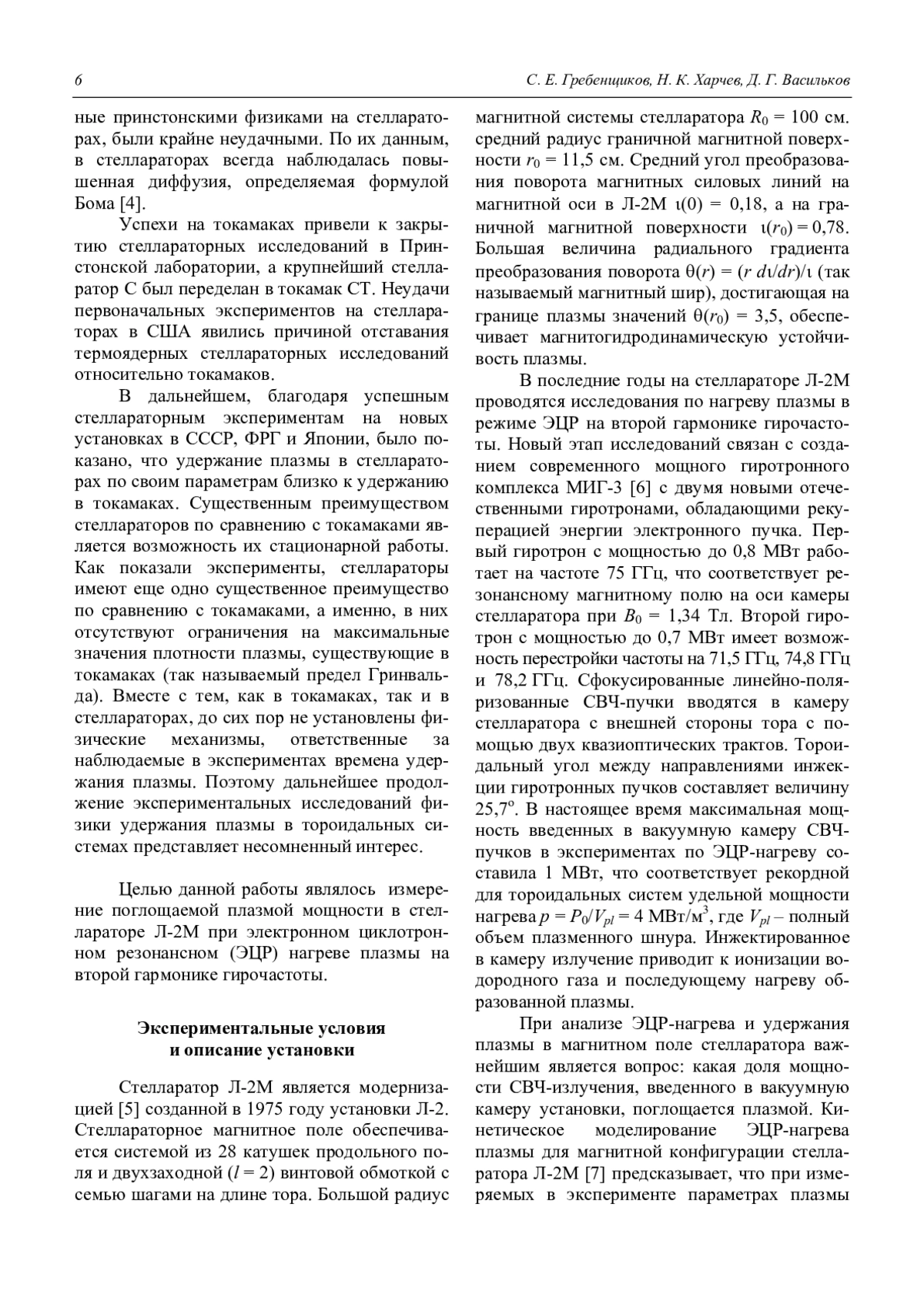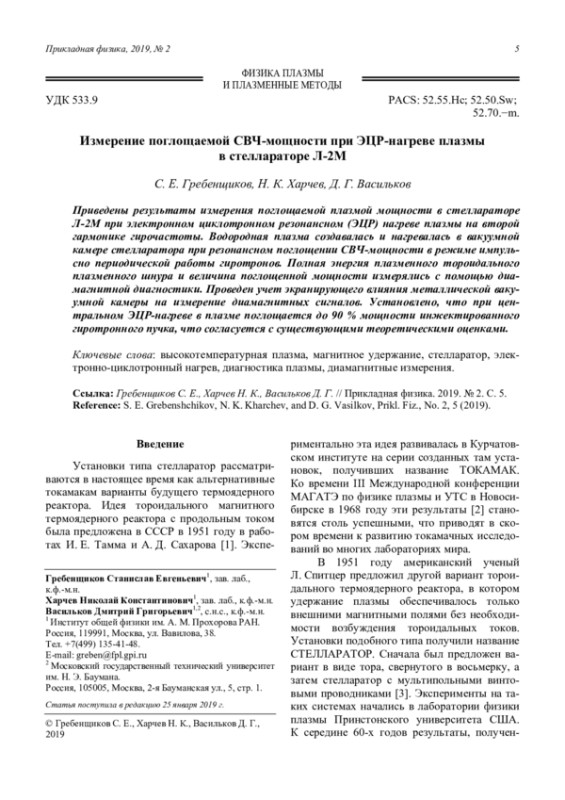 Гребенщиков С. Е., Харчев Н. К., Васильков Д. Г. Измерение поглощаемой СВЧ-мощности при ЭЦР-нагреве плазмы в стеллараторе Л-2М 5