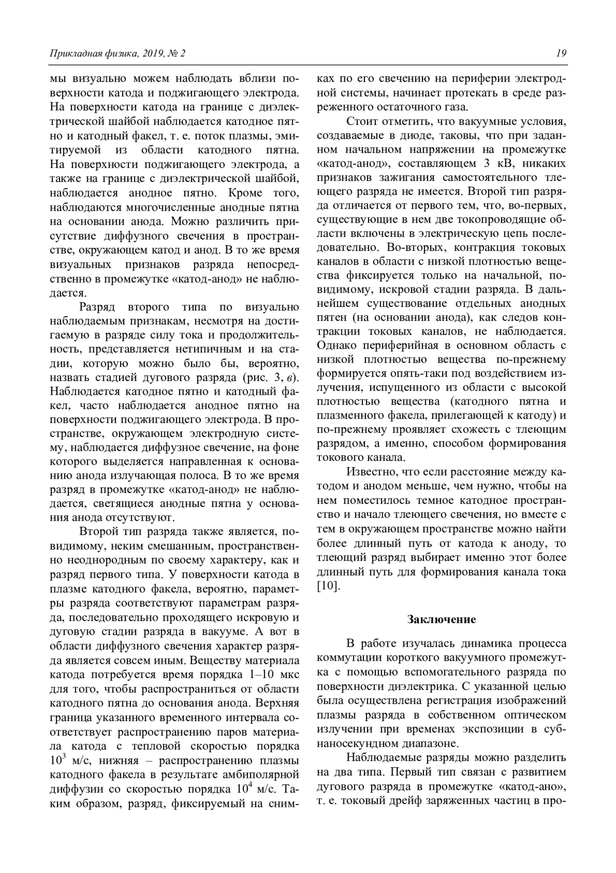 Наблюдаемые разряды можно разделить на два типа. Первый тип связан с развитием дугового разряда в промежутке «катод-ано», т. е. токовый дрейф заряженных частиц в проводящей среде (плазме) происходит по кратчайшей траектории между катодом и анодом. Параллельно каналу дугового разряда наблюдается канал диффузного разряда. Второй тип разряда характеризуется образованием катодного пятна (пятен) на катоде, выбросом в окружающее пространство плазменного факела, продолжением которого является дугообразная диффузная область разряда, замыкающаяся на основание анода, но при этом визуальных признаков развития разряда по наиболее короткой траектории в промежутке «катод-анод» не наблюдается.