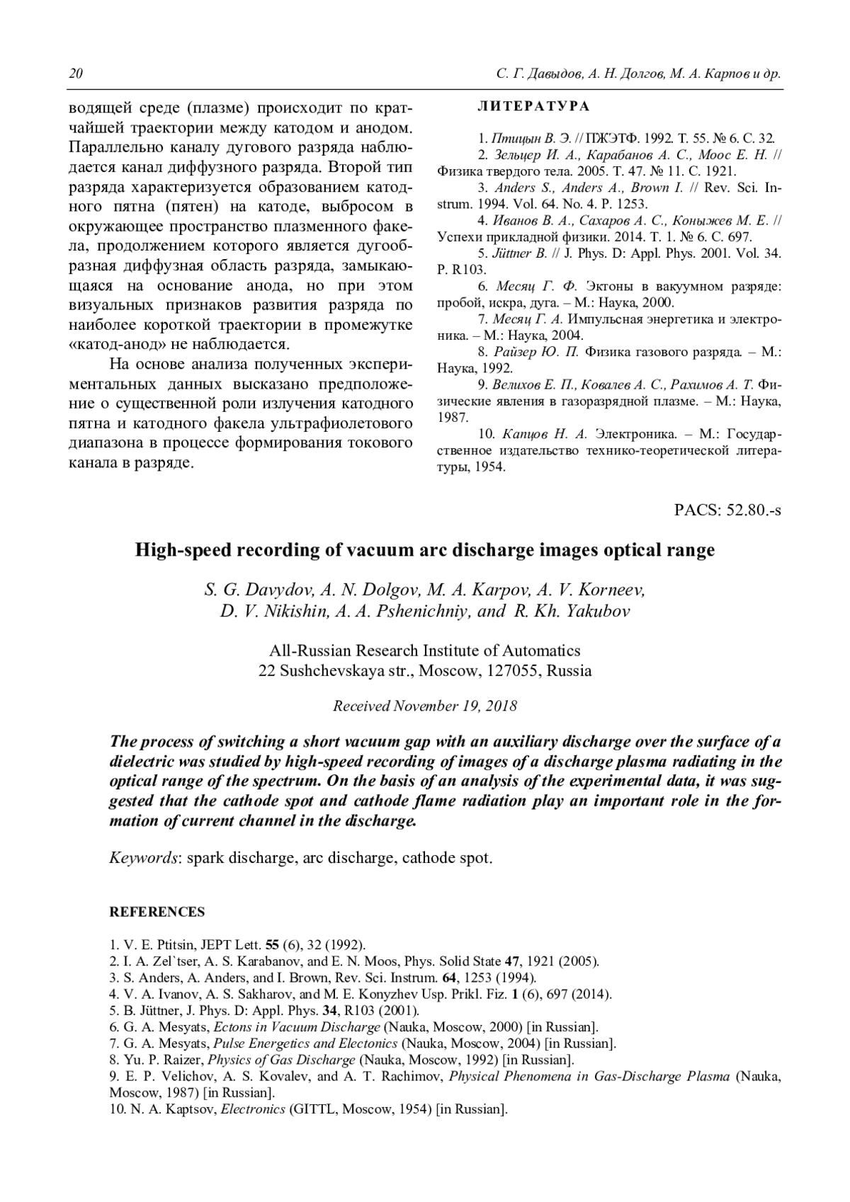 S. G. Davydov, A. N. Dolgov, M. A. Karpov, A. V. Korneev, D. V. Nikishin, A. A. Pshenichniy, and R. Kh. Yakubov High-speed recording of vacuum arc discharge images optical range 15