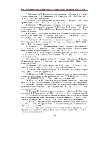 6. Инглхарт, Р. Культурная эволюция. Как изменяются человеческие мотивации и как это меняет мир / Р. Инглхарт; пер. с англ. С. Л. Лопатиной. - 2-е изд. - М.: Социум, 2020. - 347 с. - Текст: непосредственный.