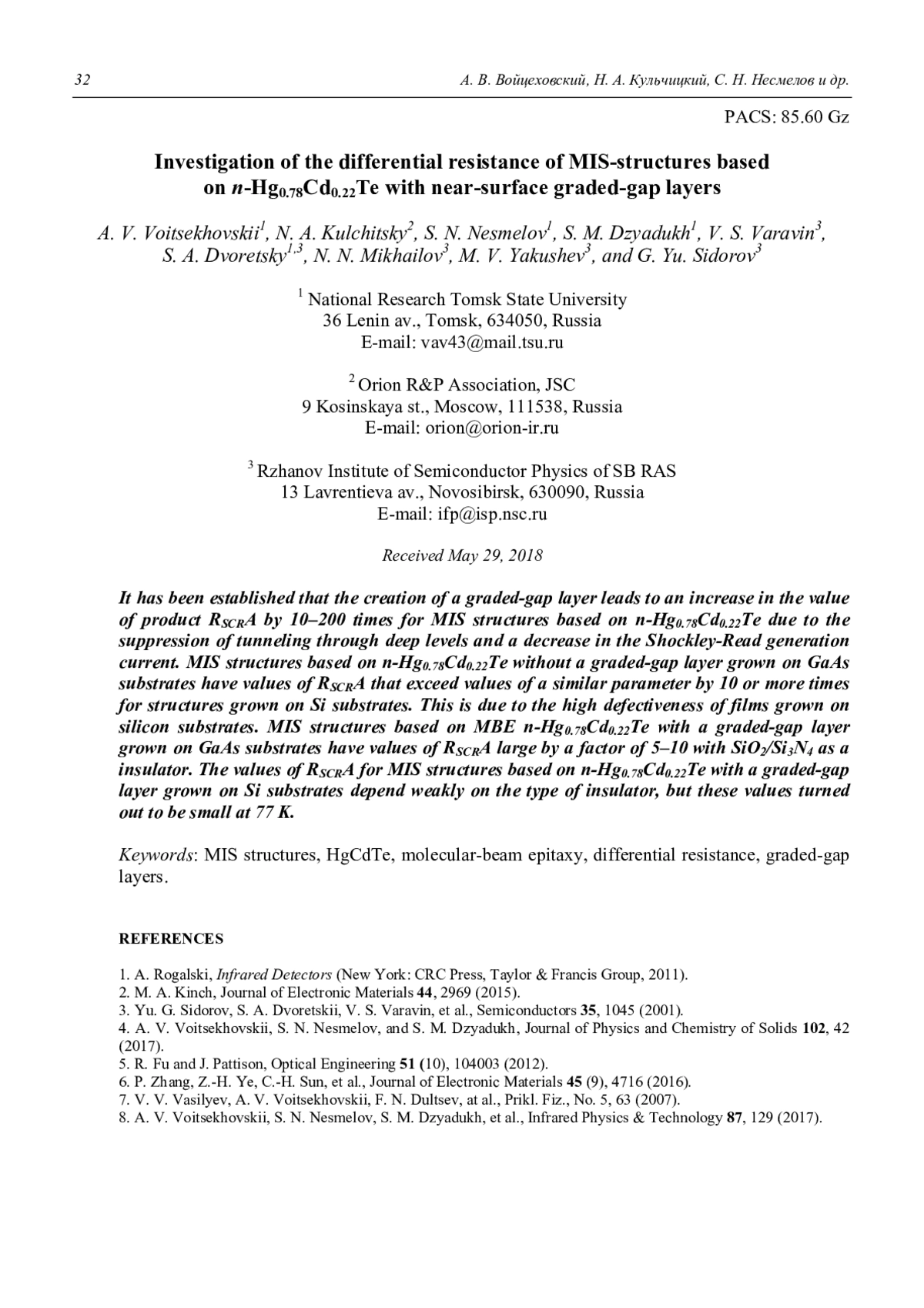 A. V. Voitsekhovskii, N. A. Kulchitsky, S. N. Nesmelov, S. M. Dzyadukh, V. S. Varavin, S. A. Dvo-retsky, N. N. Mikhailov, M. V. Yakushev, and G. Yu. Sidorov Investigation of the differential resistance of MIS-structures based on n-Hg0.78Cd0.22Te with near-surface graded-gap layers 28