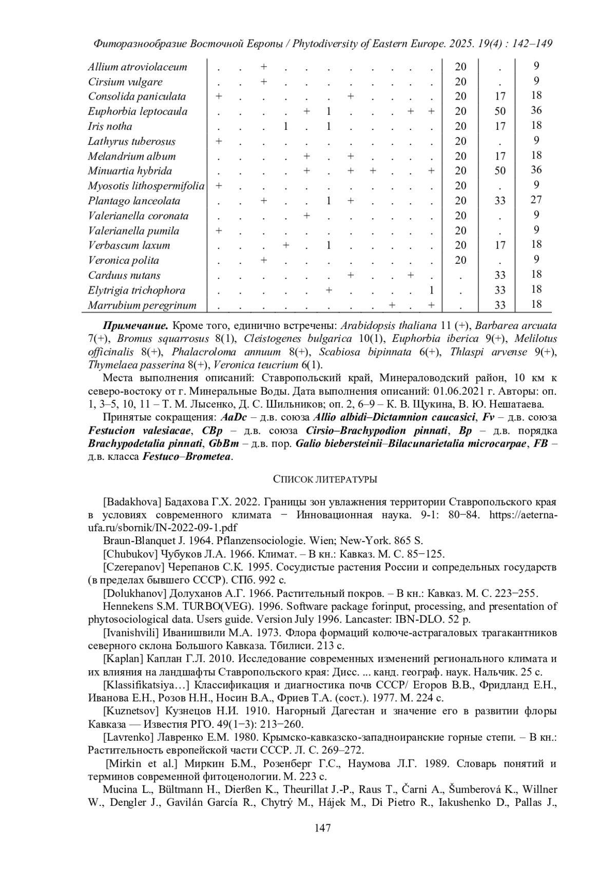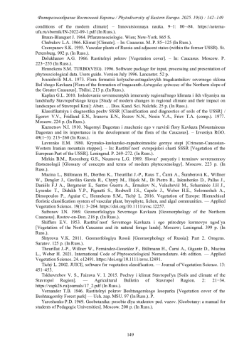 1. [Badakhova] Бадахова Г.Х. 2022. Границы зон увлажнения территории Ставропольского края в условиях современного климата - Инновационная наука. 9-1: 80-84. https://aeterna-ufa.ru/sbornik/IN-2022-09-1.pdf Braun-Blanquet J. 1964. Pflanzensociologie. Wien; New-York. 865 S. EDN: KNZHUO