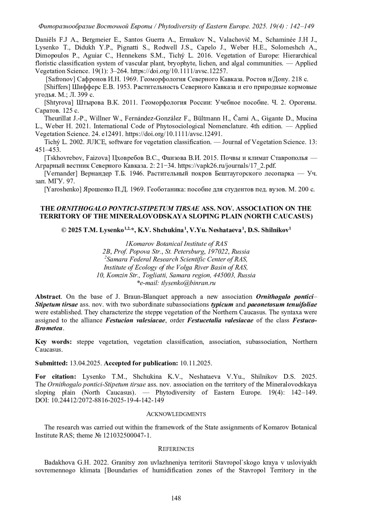 На основе использования подхода Ж. Браун-Бланке установлена новая ассоциация Ornithogalo pontici - Stipetum tirsae ass. nov. с подчиненными ей субассоциациями typicum и paeonetosum tenuifoliae. Они характеризуют степную растительность Северного Кавказа. Синтаксоны отнесены к союзу Festucion valesiacae, порядку Festucetalia valesiacae класса Festuco - Brometea.