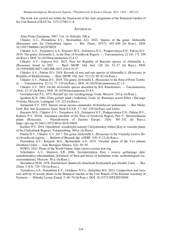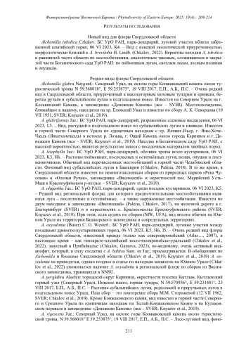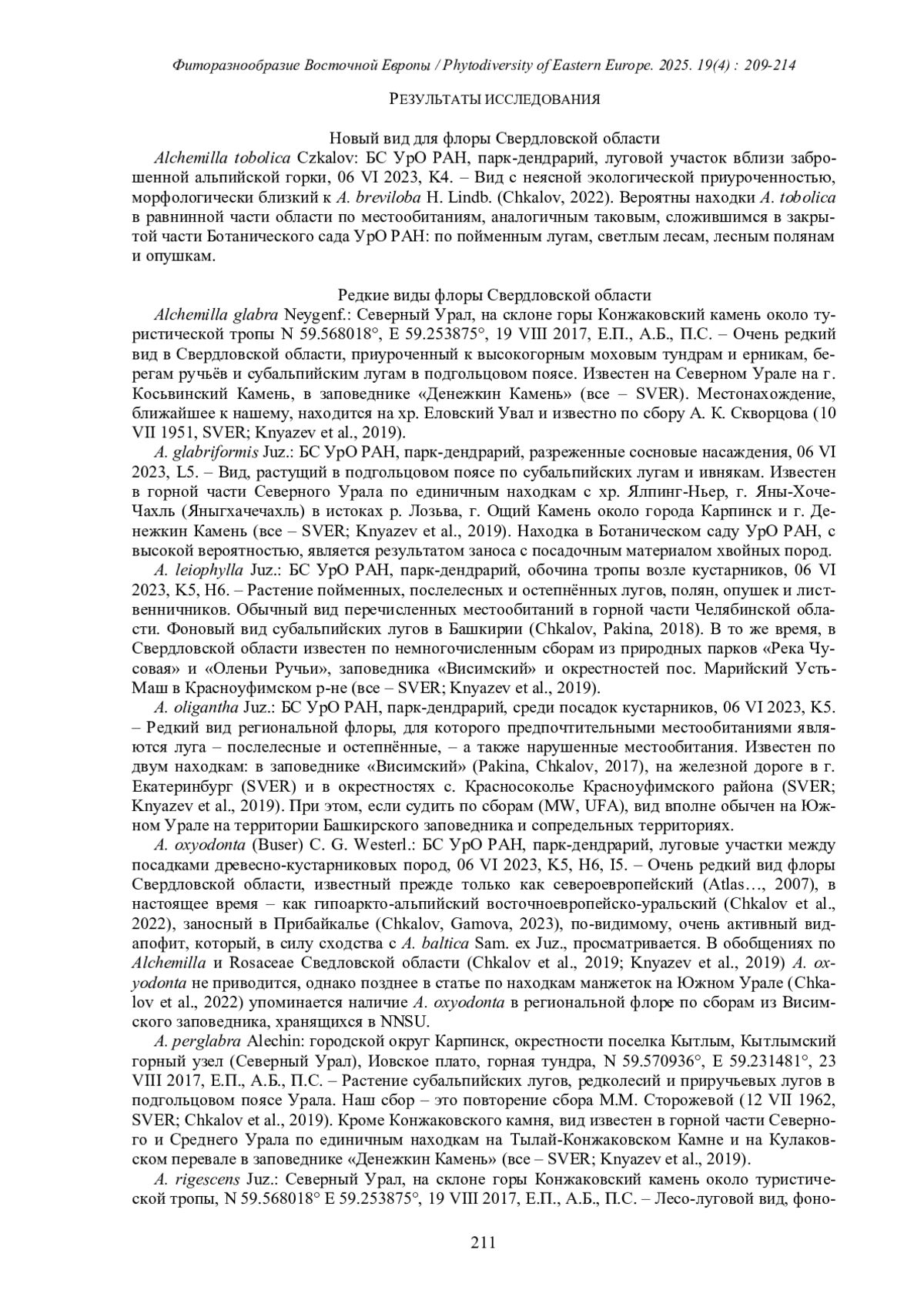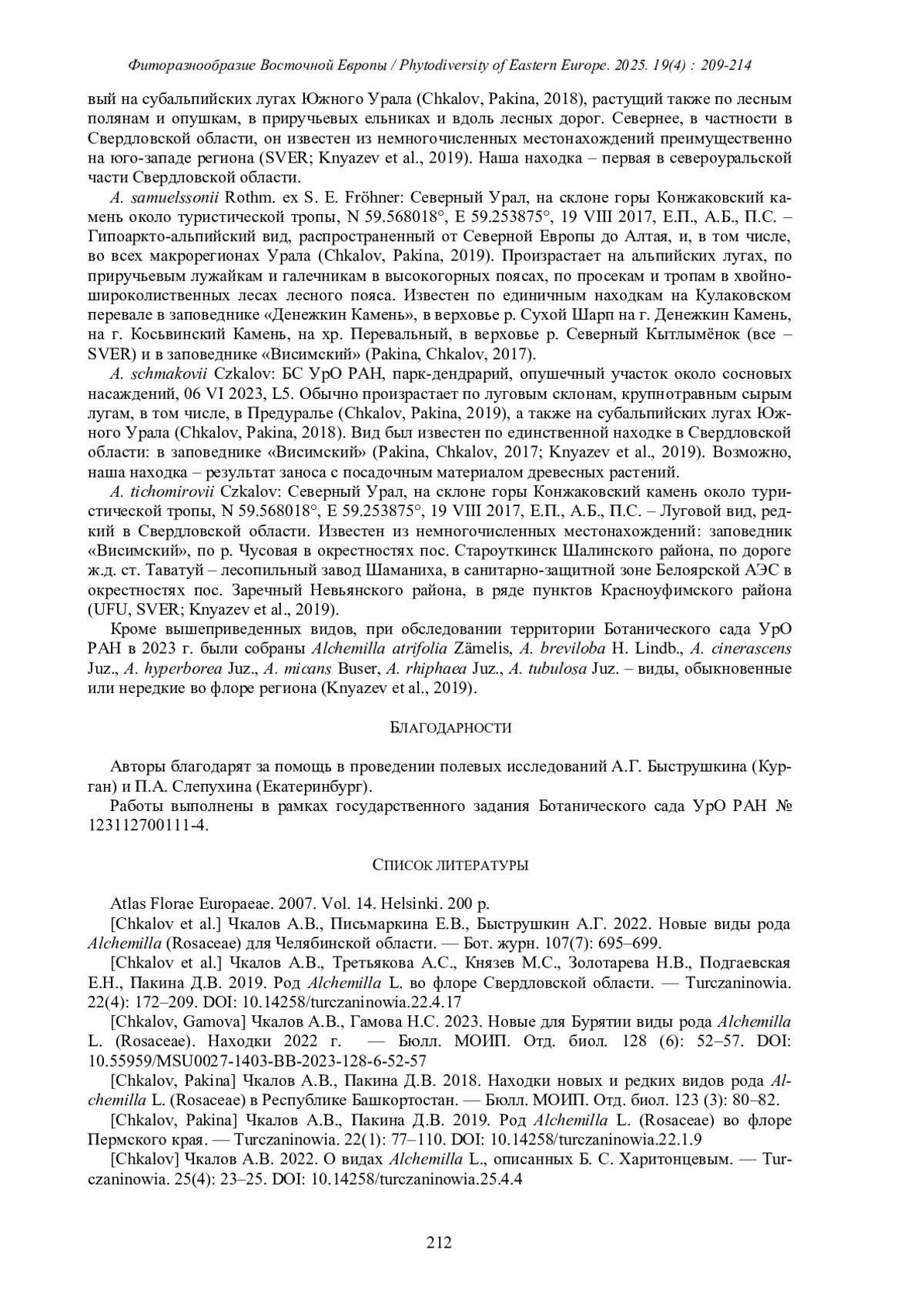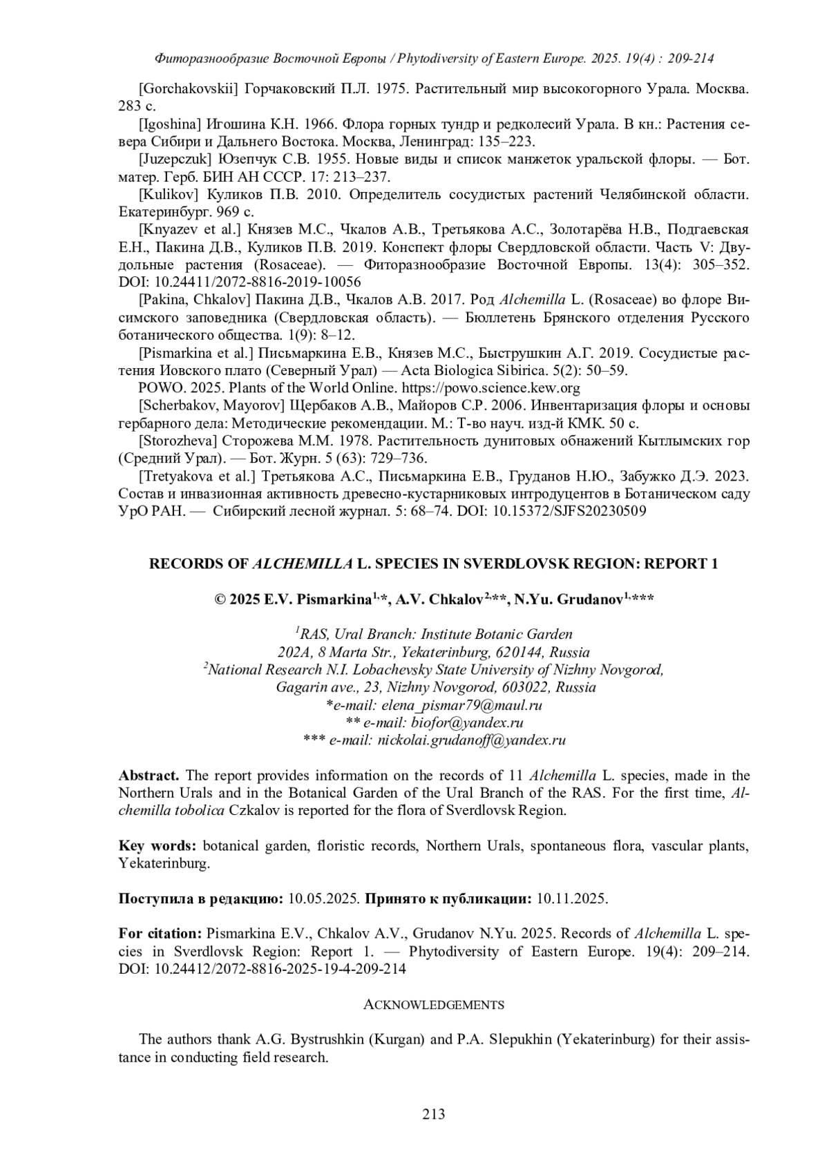 ПИСЬМАРКИНА Е. В., ЧКАЛОВ А. В., ГРУДАНОВ Н. Ю. НАХОДКИ ВИДОВ ALCHEMILLA L. В СВЕРДЛОВСКОЙ ОБЛАСТИ: СООБЩЕНИЕ 1 // ФИТОРАЗНООБРАЗИЕ ВОСТОЧНОЙ ЕВРОПЫ. 2025. Т. 19 № 4