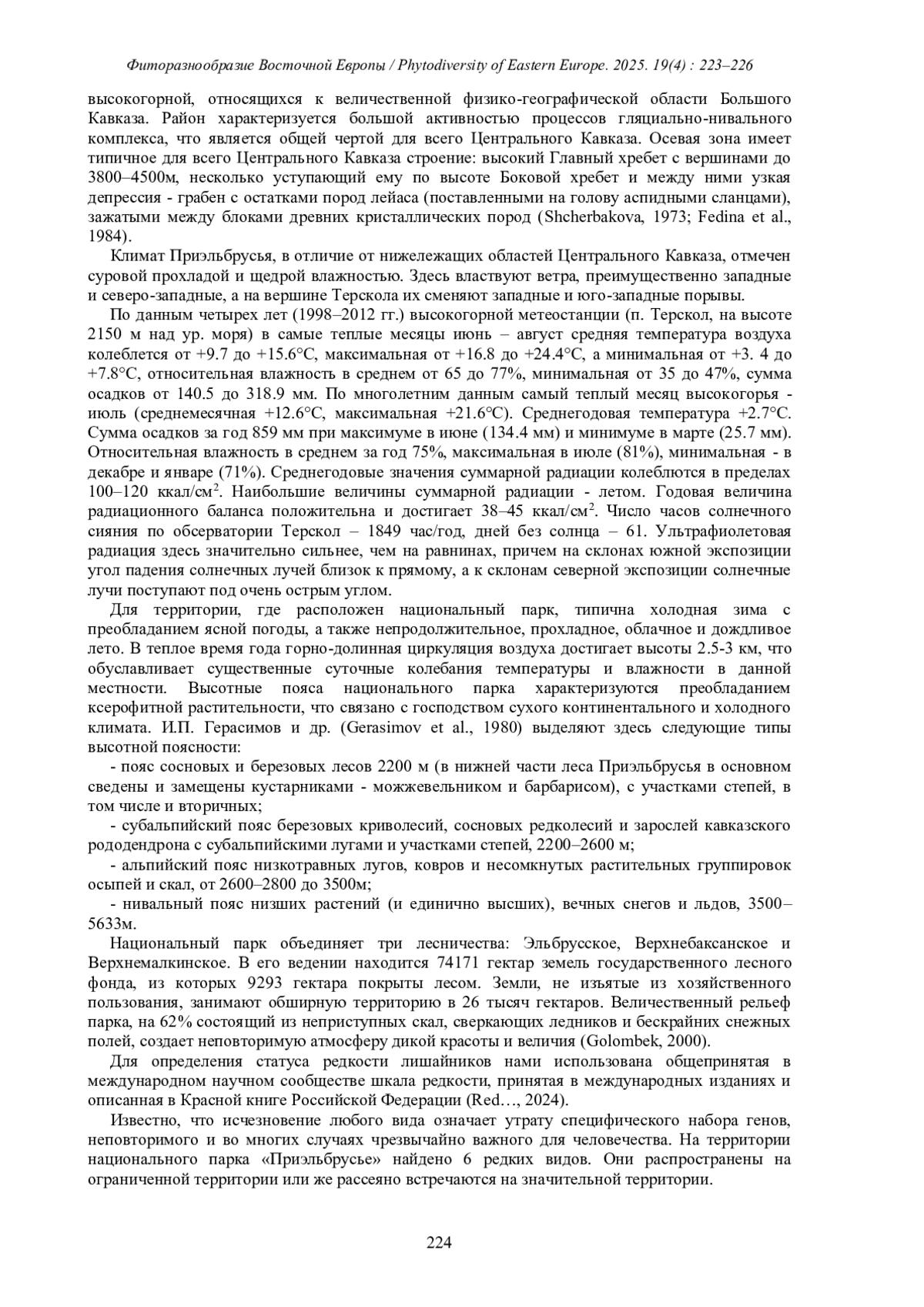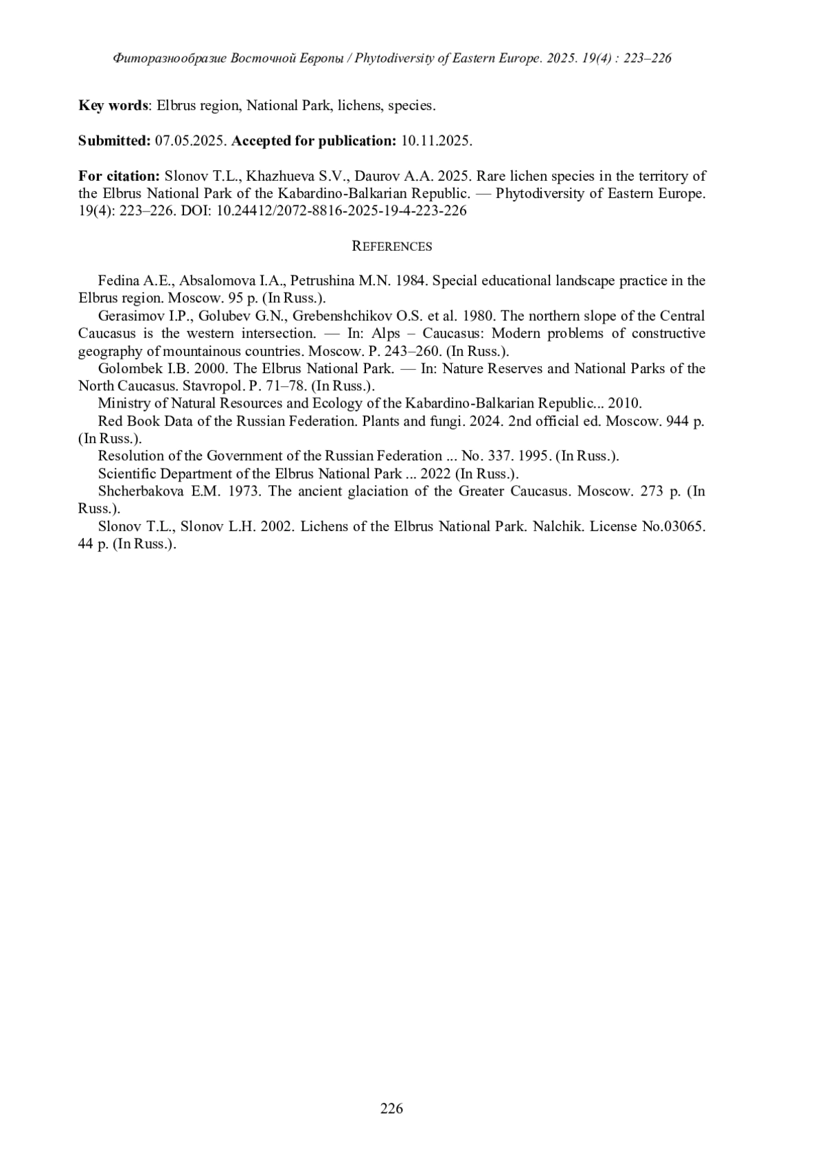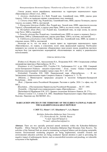 СЛОНОВ Т.Л., ХАЖУЕВА С.В., ДАУРОВ А.А. РЕДКИЕ ВИДЫ ЛИШАЙНИКОВ НА ТЕРРИТОРИИ НАЦИОНАЛЬНОГО ПАРКА «ПРИЭЛЬБРУСЬЕ» КАБАРДИНО-БАЛКАРСКОЙ РЕСПУБЛИКИ // ФИТОРАЗНООБРАЗИЕ ВОСТОЧНОЙ ЕВРОПЫ. 2025. Т. 19 № 4
