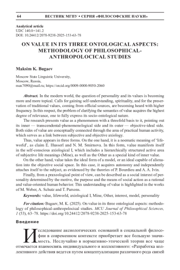 В современных реалиях все острее встает вопрос о человеке как личности и его ценностях. Из официальных источников все чаще слышны призывы к обретению самосознания и духовности, сохранению традиционных ценностей. В связи с этим высшую степень релевантности приобретает проблема прояснения семантики ценности, причем такой, в котором бы в полной мере была выражена ее социально-онтологическая природа.
