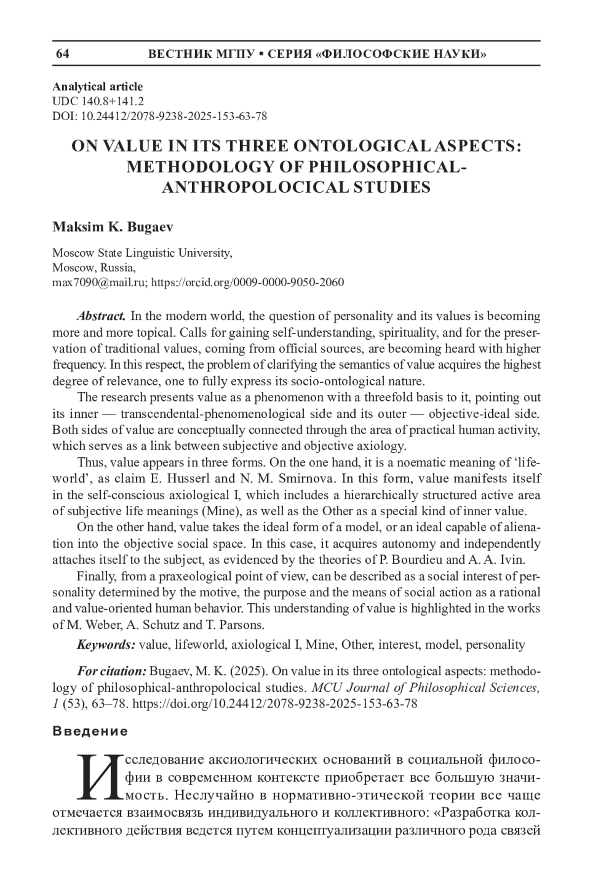 Таким образом, ценность предстает в трех формах. С одной стороны, она есть ноэматический смысл жизненного мира, о чем пишут Э. Гуссерль и Н. М. Смирнова. В таком виде ценность проявляется в самосознающем аксиологическом Я, включающем иерархически выстроенную активную область субъективных жизненных смыслов (Мое), а также Другого как особый вид внутренней ценности. С другой стороны, ценность может принимать идеальную форму образца, или идеала, способного к отчуждению в объективное социальное пространство. В таком случае она приобретает автономность и самостоятельно приобщается к субъекту, о чем свидетельствуют теории П. Бурдье и А. А. Ивина.