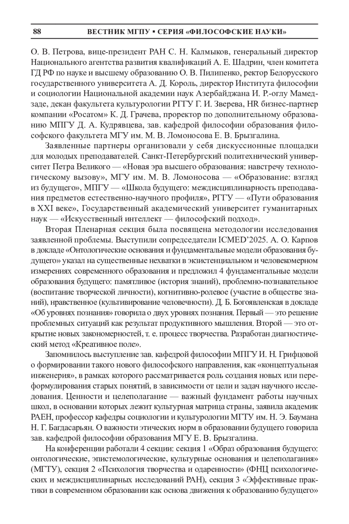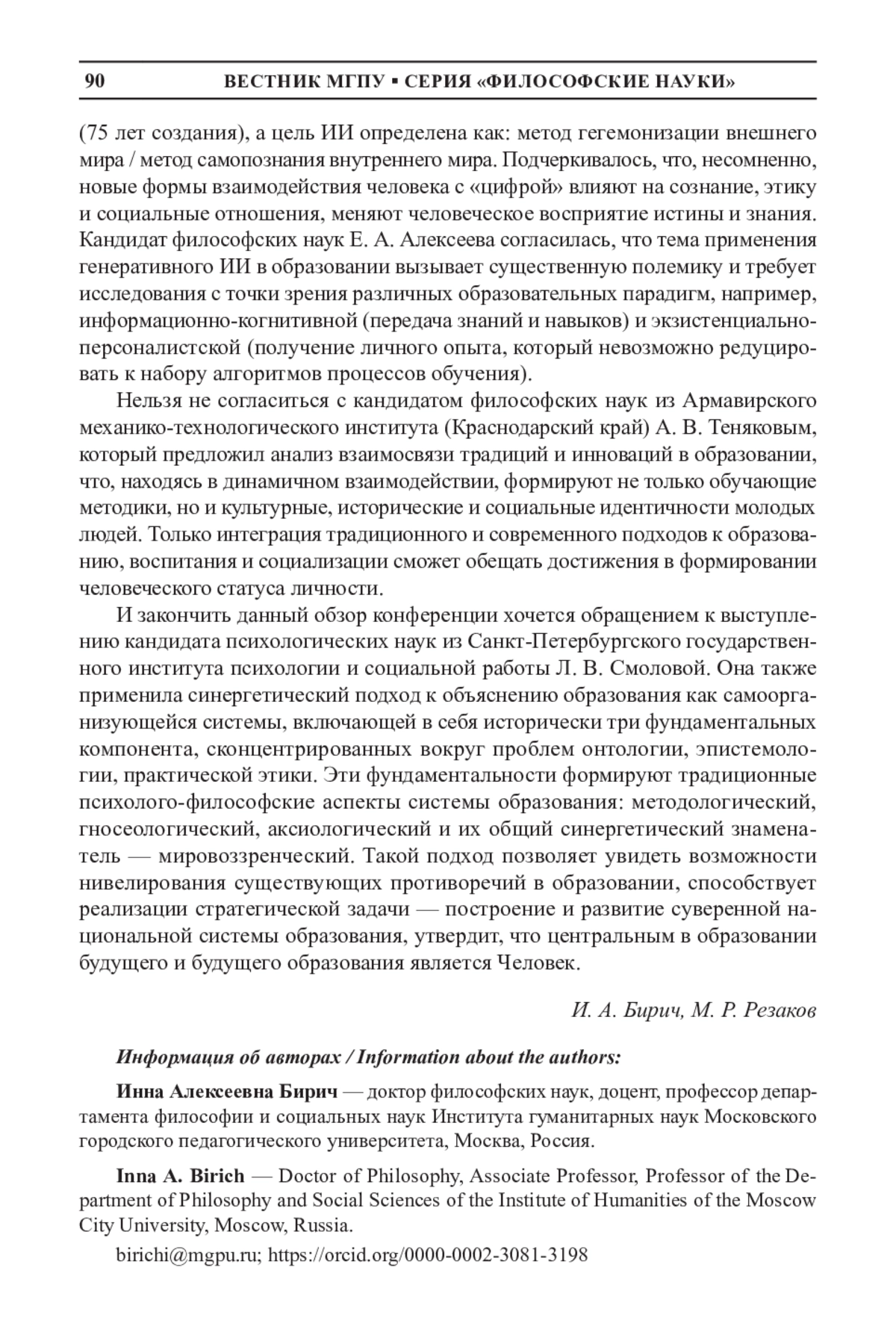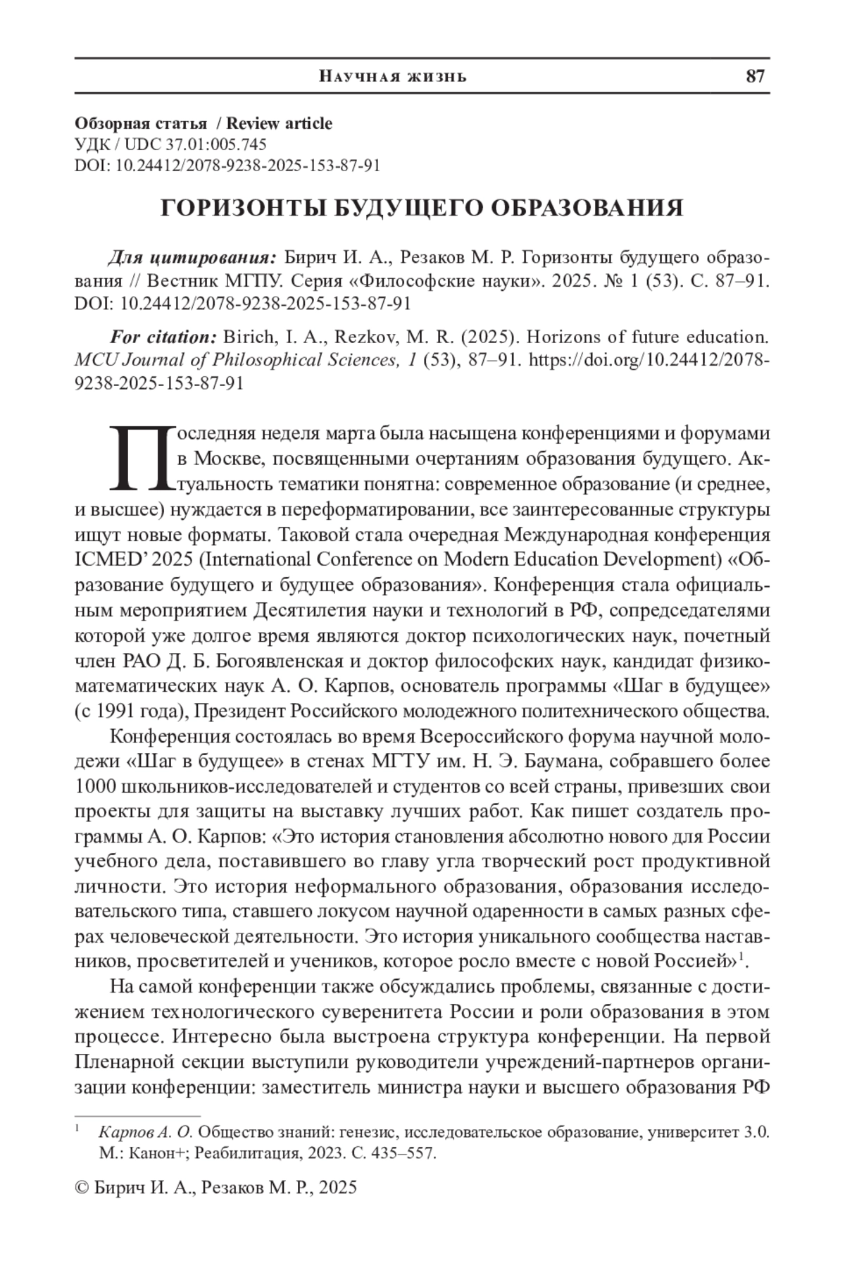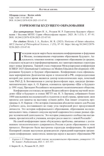 БИРИЧ И. А., РЕЗАКОВ М. Р. ГОРИЗОНТЫ БУДУЩЕГО ОБРАЗОВАНИЯ // ВЕСТНИК МГПУ. СЕРИЯ: ФИЛОСОФСКИЕ НАУКИ. 2025. № 1 (53)
