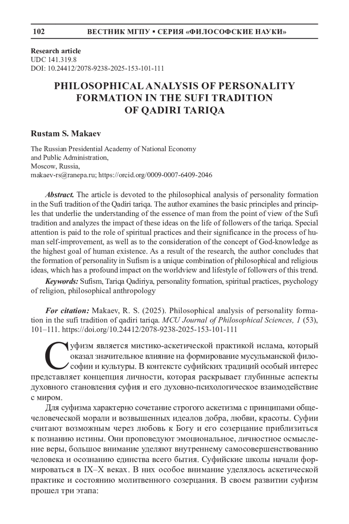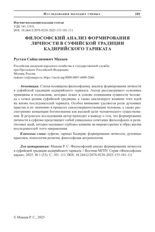 Статья посвящена философскому анализу формирования личности в суфийской традиции кадирийского тариката. Автор рассматривает основные принципы и положения, которые лежат в основе понимания сущности человека с точки зрения суфийской традиции, а также анализирует влияние этих идей на жизнь последователей тариката. Особое внимание уделяется роли духовных практик и их значению в процессе самосовершенствования человека, а также рассмотрению концепции богопознания как высшей цели человеческого существования. В результате исследования автор приходит к выводу о том, что формирование личности в суфизме представляет собой уникальное сочетание философских и религиозных идей, которое оказывает глубокое влияние на мировоззрение и образ жизни последователей этого направления.