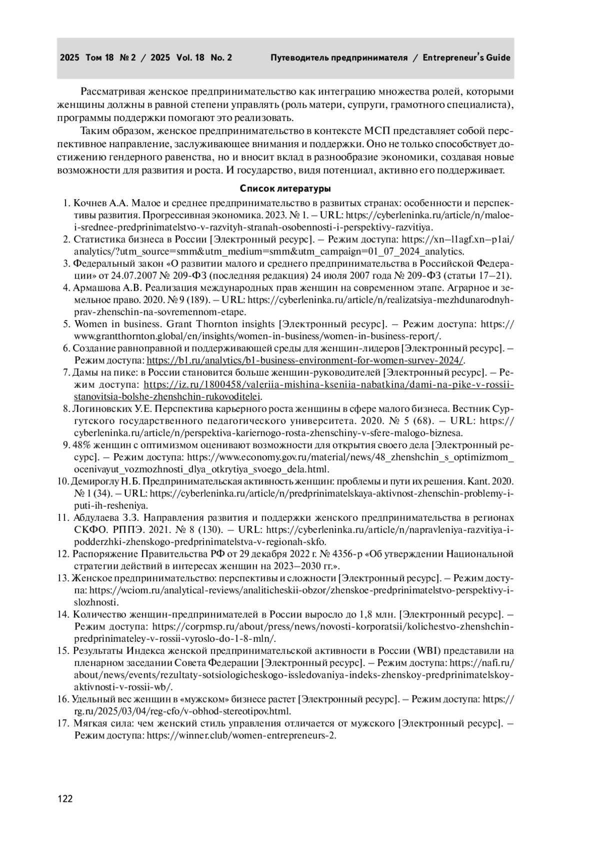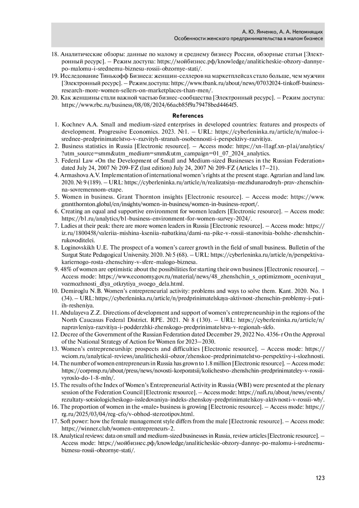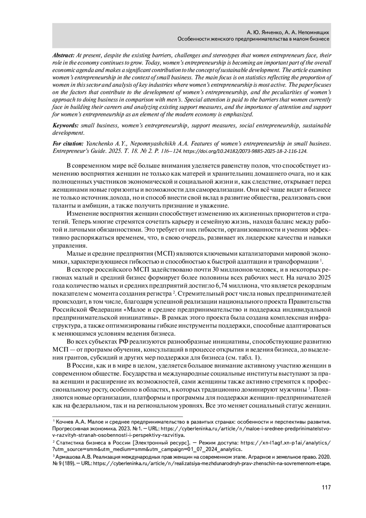 ЯНЧЕНКО А. Ю., НЕПОМНЯЩИХ А. А. ОСОБЕННОСТИ ЖЕНСКОГО ПРЕДПРИНИМАТЕЛЬСТВА В МАЛОМ БИЗНЕСЕ // РОССИЙСКАЯ АКАДЕМИЯ ПРЕДПРИНИМАТЕЛЬСТВА. 2025. Т. 18, № 2