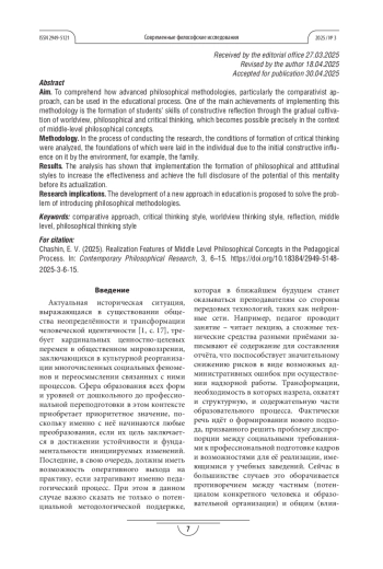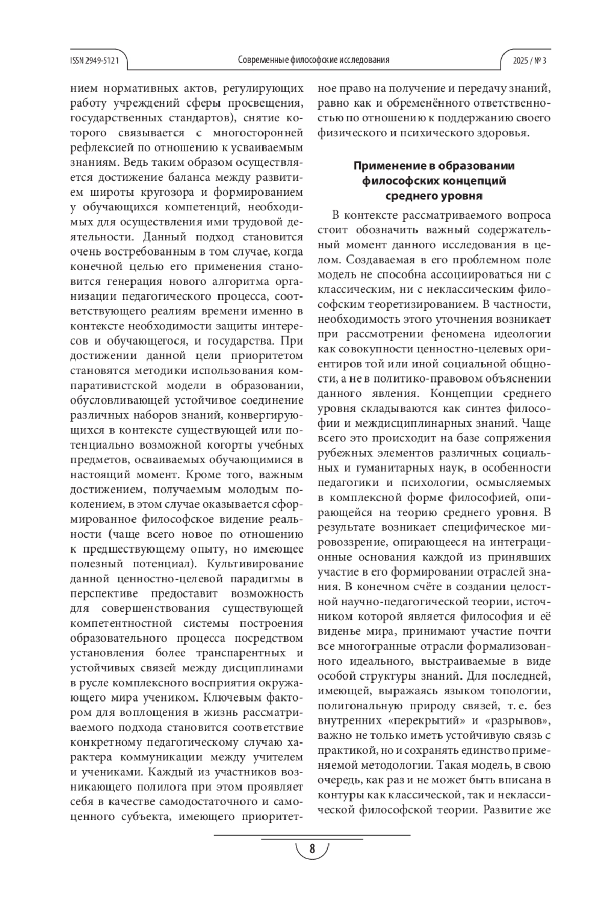 Статья: Особенности реализации философских концепций среднего уровня в педагогическом процессе (2025)