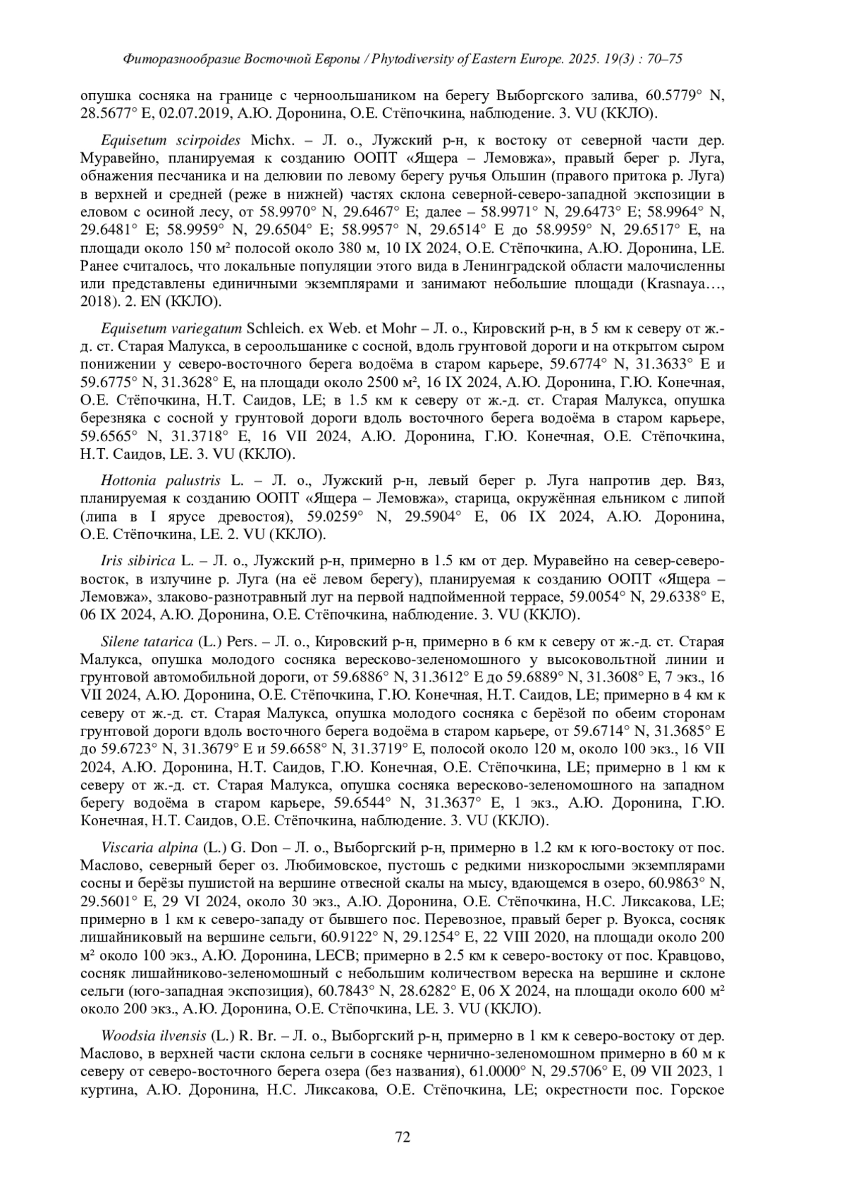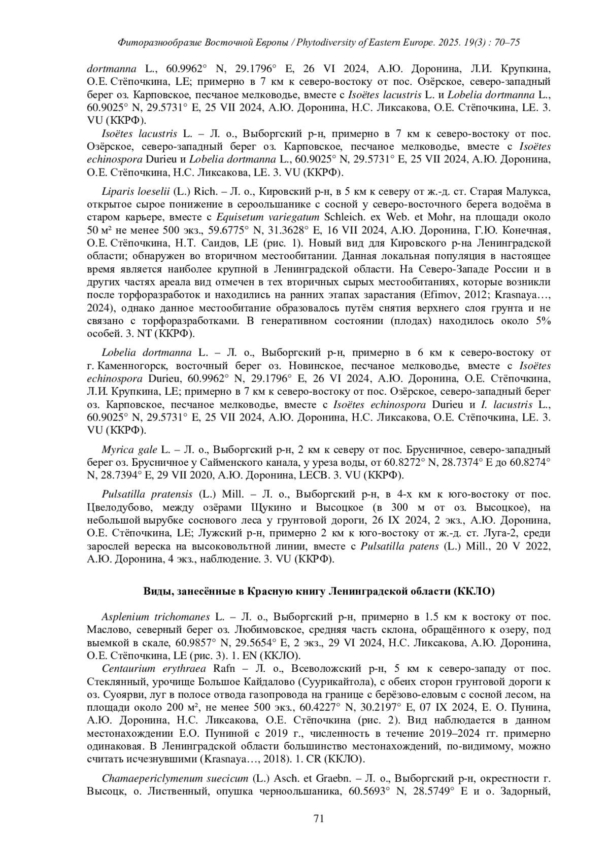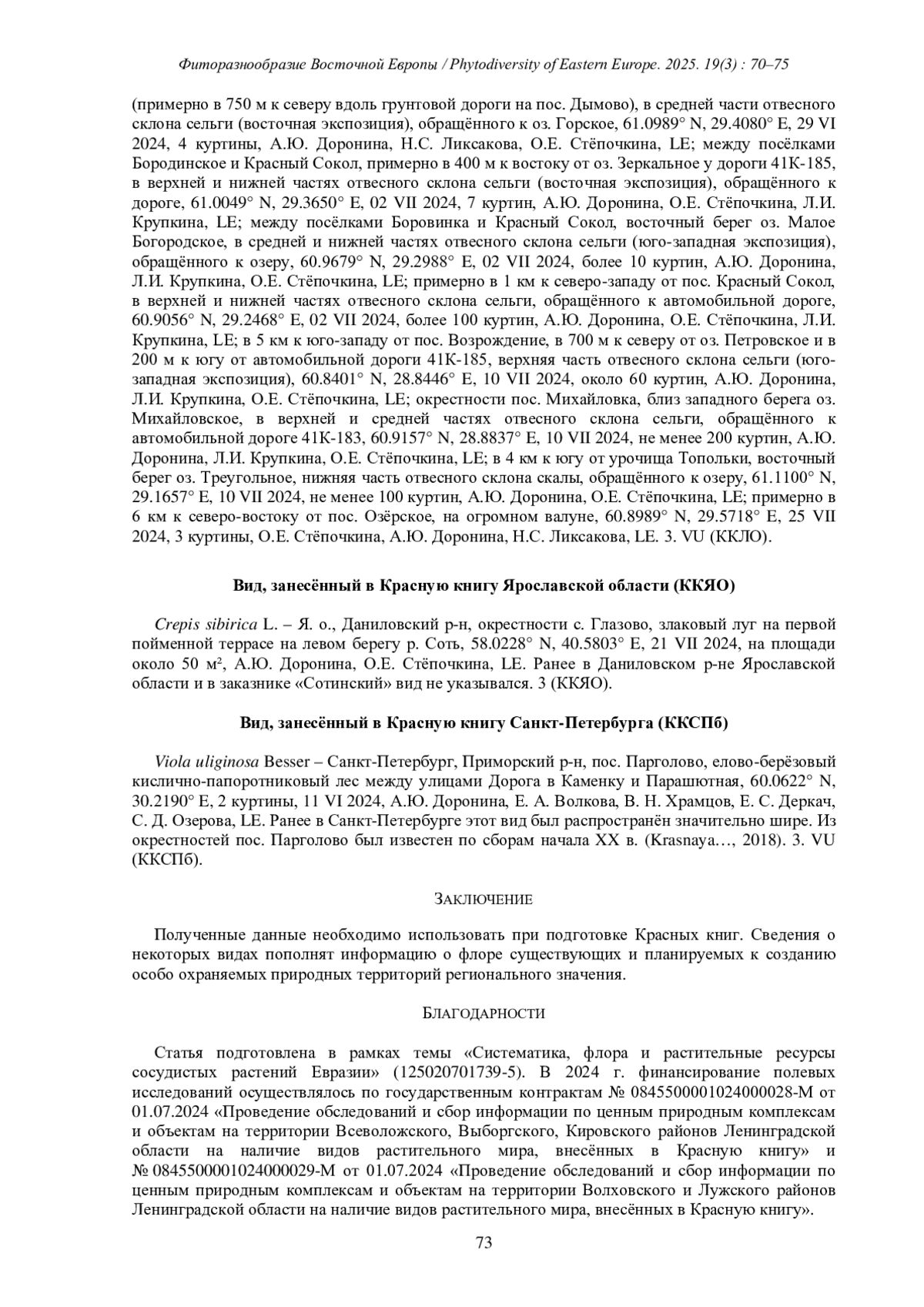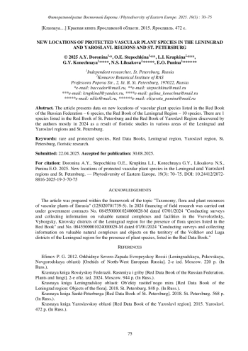 ПУНИНА Е. О., ЛИКСАКОВА Н.С., КОНЕЧНАЯ Г.Ю., СТЁПОЧКИНА О.Е., ДОРОНИНА А.Ю. НОВЫЕ МЕСТОНАХОЖДЕНИЯ ОХРАНЯЕМЫХ ВИДОВ СОСУДИСТЫХ РАСТЕНИЙ В ЛЕНИНГРАДСКОЙ И ЯРОСЛАВСКОЙ ОБЛАСТЯХ И САНКТ-ПЕТЕРБУРГЕ // ФИТОРАЗНООБРАЗИЕ ВОСТОЧНОЙ ЕВРОПЫ. 2025. Т. 19 № 3