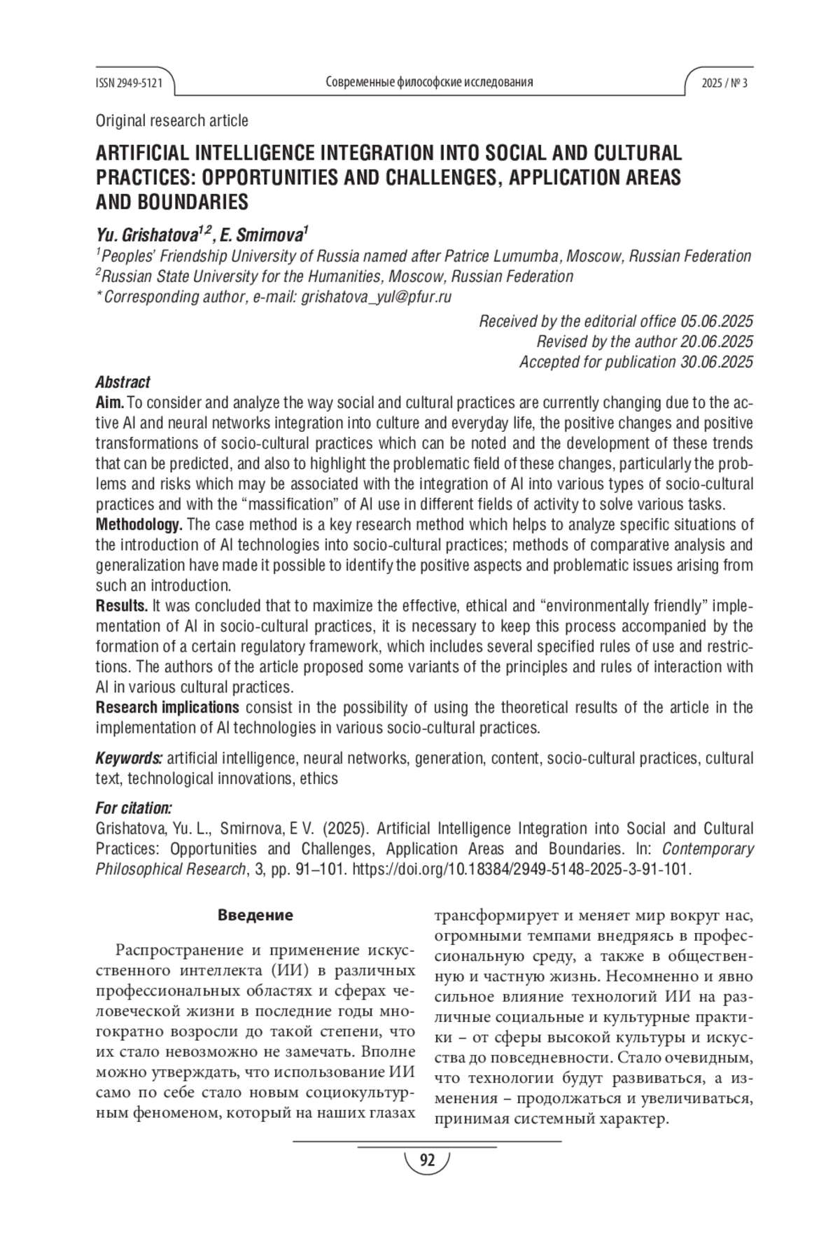 Процедура и методы. Ключевым исследовательским методом является кейс-метод как способ анализа конкретных ситуаций внедрения технологий ИИ в социокультурные практики. Методы сравнительного анализа и обобщения позволили выделить положительные стороны и проблемные вопросы, возникающие в результате такого внедрения.