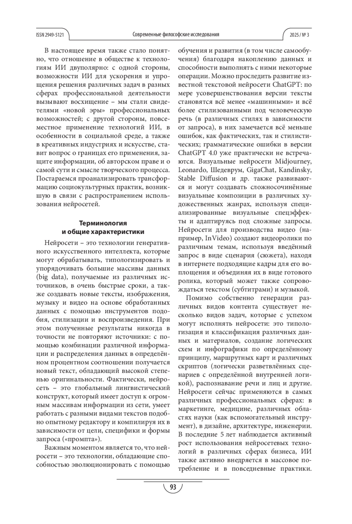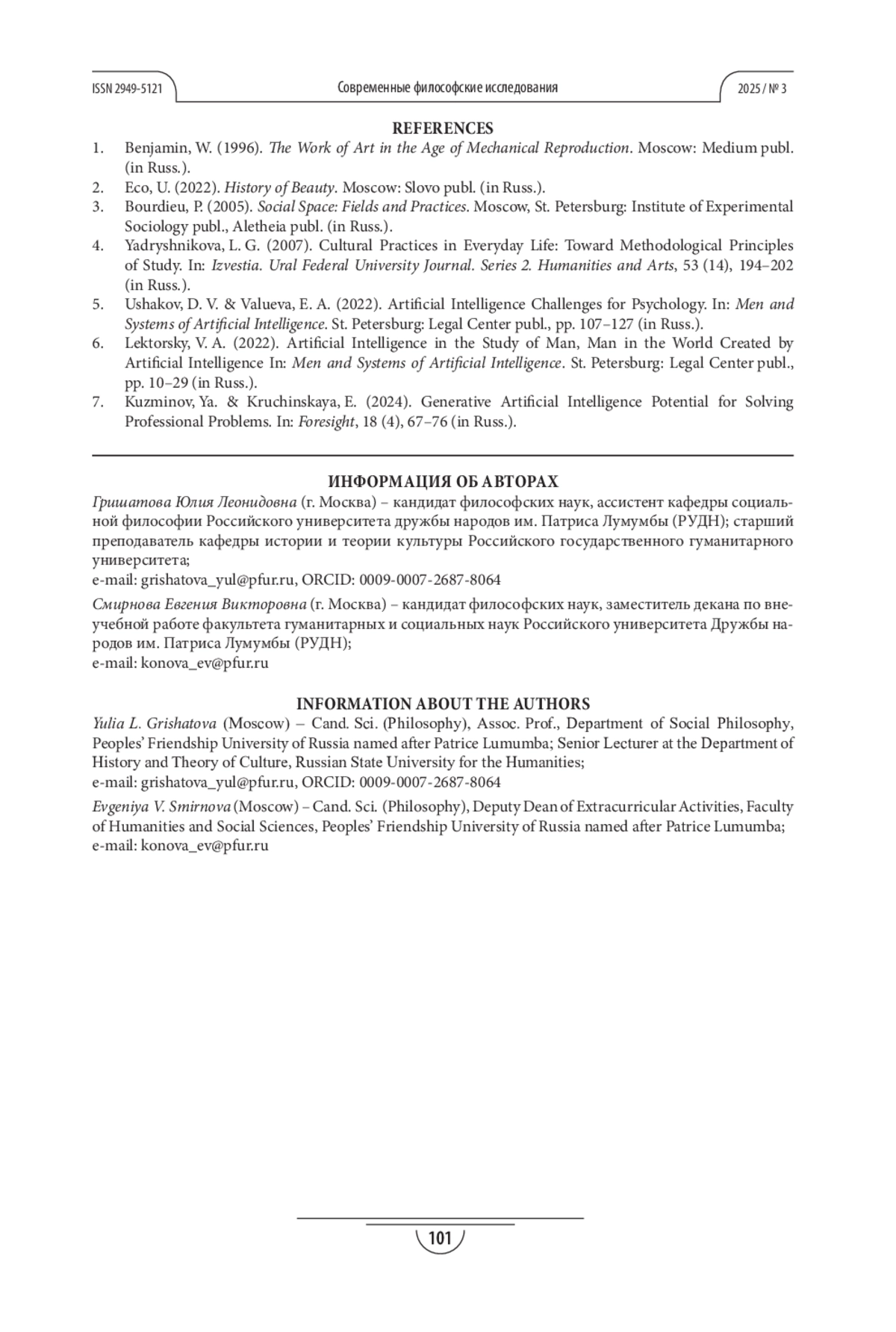 Результаты. Был сделан вывод, что в целях максимально эффективного, этичного и «экологичного» внедрения ИИ в социокультурные практики нужно, чтобы этот процесс сопровождался формированием определённой нормативно-правовой базы, представляющей из себя ряд конкретизированных правил использования и ограничений. Авторами статьи были предложены некоторые варианты принципов и правил взаимодействия с ИИ в различных культурных практиках.