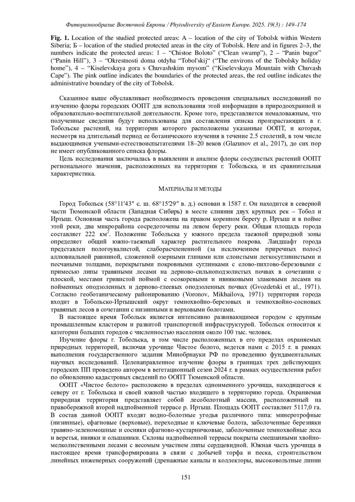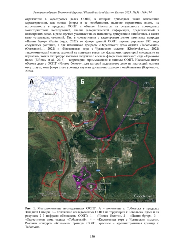 Согласно последнему реестру особо охраняемых природных территорий (ООПТ) Тюменской области (Perechen’…, 2025) на территории Тобольского района области действует восемь ООПТ регионального значения, из них в пределах г. Тобольска – три памятника природы (ПП). В соответствии со схемой размещения и развития ООПТ регионального значения Тюменской области (Postanovlenie …, 2025) состав действующих ООПТ Тобольского района дополнен еще четырьмя объектами, один из которых – «Чистое болото» – расположен на территории г. Тобольска. Таким образом, к настоящему времени в пределах города располагается четыре ООПТ регионального значения (рис. 1).