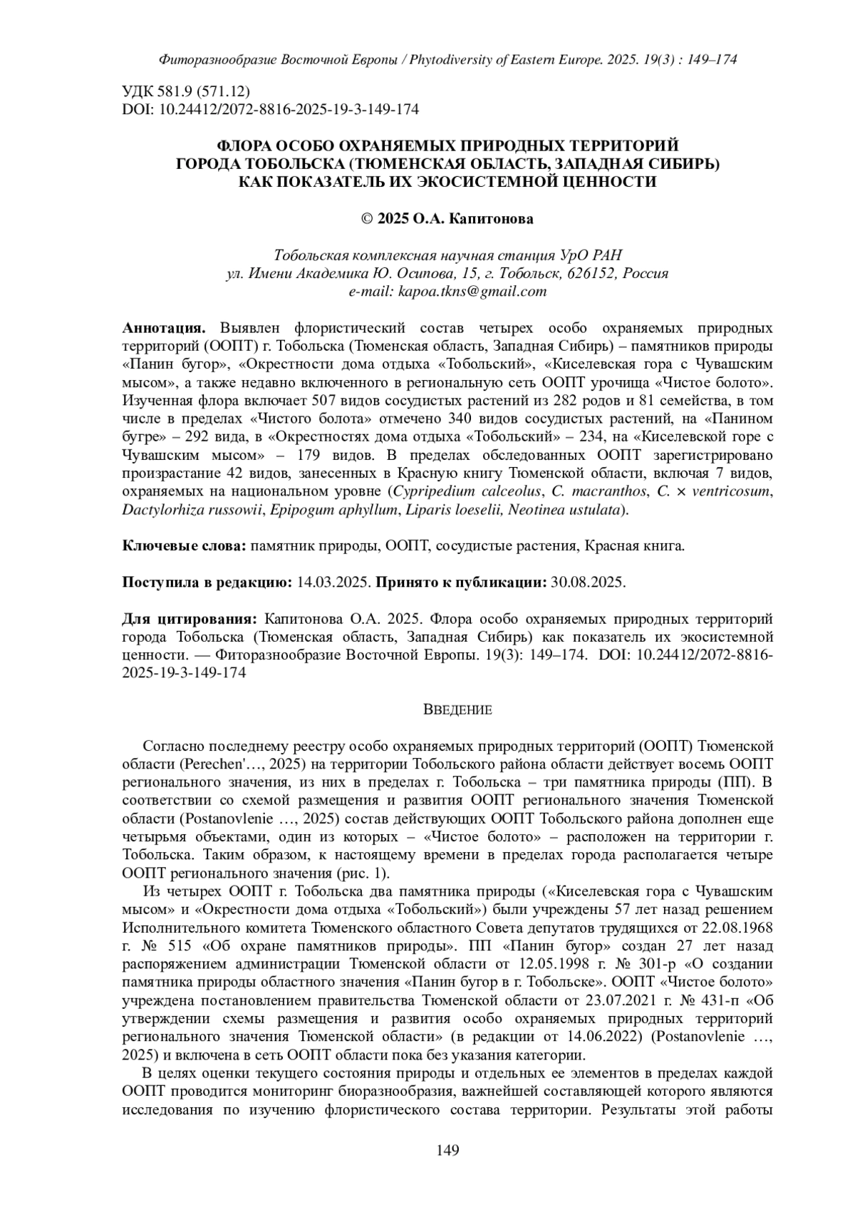 12. [Kapitonova] Капитонова О.А. 2024. Конспект флоры особо охраняемой природной территории “Чистое болото” (Тюменская область). - Природное и историко-культурное наследие Сибири. 2(2): 12-29. DOI: 10.25713/HS.2024.3.2.002 EDN: TWRMXY