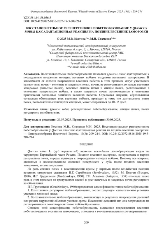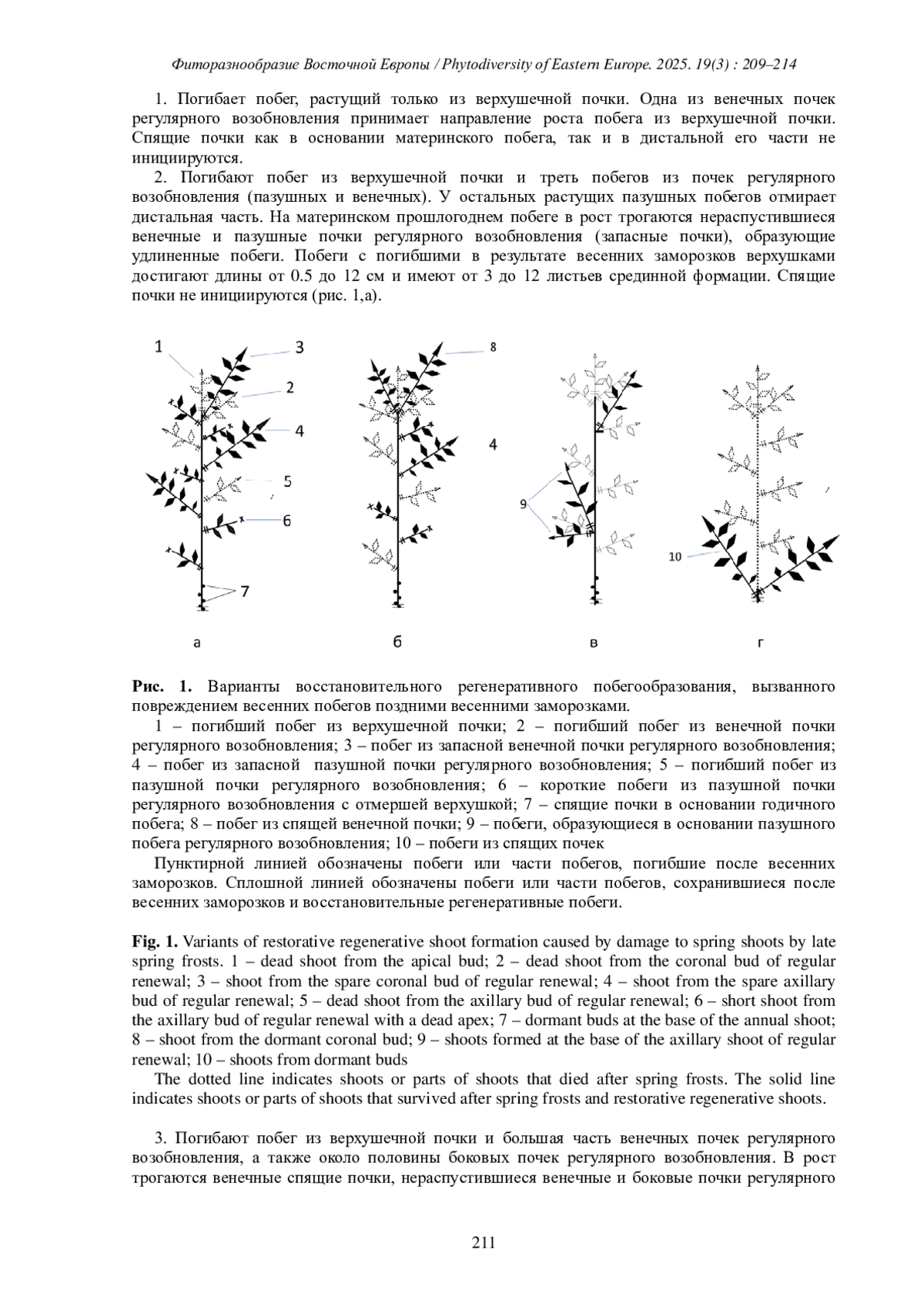 На основе анализа литературных данных (Paderevskaya, 1953; Astapova, 1954, Grudzinskaya, 1960) на годичном побеге мы выделили следующие типы почек, которые различаются по строению, динамике развития и выполняемым функциям. В основании побега в пазухах почечных чешуй закладываются спящие почки длиной 0.1–0.2 см. Спящие почки также формируются в пазухах самых нижних быстро опадающих небольших листьев срединной формации. Следует отметить, что спящими принято назвать почки, которые находятся в состоянии относительного покоя более двух лет (Serebryakov, 1952; Lyashenko, 1958; Busgen, 1960). Спящие почки могут пробуждаться в результате повреждения ствола (ветви), естественного старении системы побегов, и как уже отмечалось выше, в результате повреждения растений поздними весенними заморозками или насекомыми. Выше по оси годичного побега формируются пазушные почки регулярного возобновления до 0.6–0.7 см длиной, которые после зимнего периода покоя трогаются в рост, образуя боковые побеги. Эти почки имеют более крупные по сравнению со спящими почками размеры и содержат большее число листовых зачатков. Если они не тронулись в рост в текущем году, то они отмирают в конце вегетационного периода, т. е. они менее долговечны по сравнению со спящими почками.