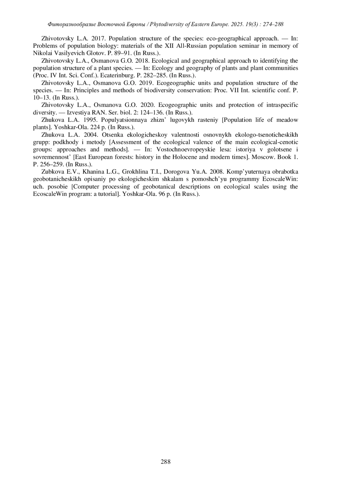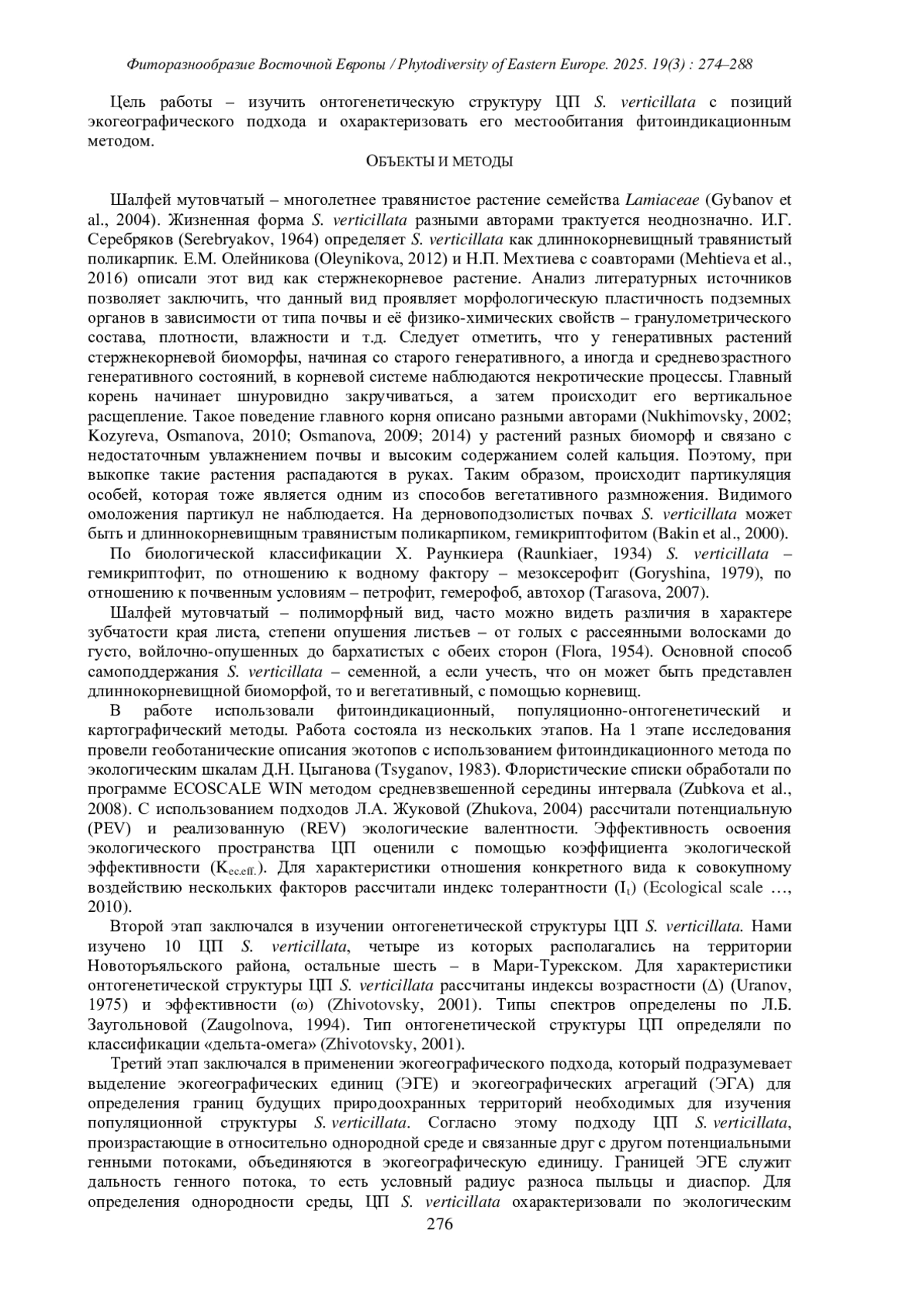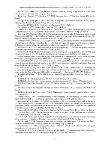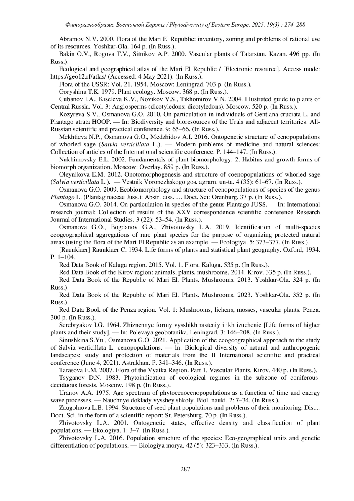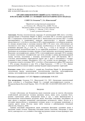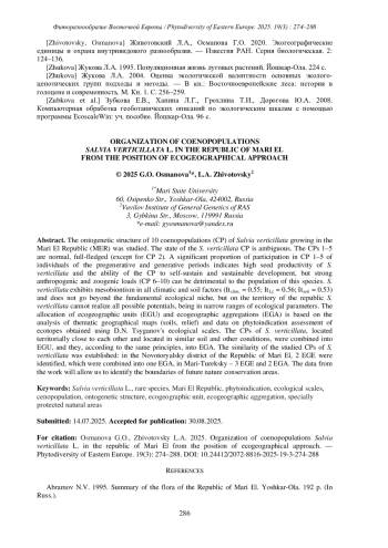 ОСМАНОВА Г.О., ЖИВОТОВСКИЙ Л.А. ОРГАНИЗАЦИЯ ЦЕНОПОПУЛЯЦИЙ SALVIAVERTICILLATA L. В РЕСПУБЛИКЕ МАРИЙ ЭЛ С ПОЗИЦИЙ ЭКОГЕОГРАФИЧЕСКОГО ПОДХОДА // ФИТОРАЗНООБРАЗИЕ ВОСТОЧНОЙ ЕВРОПЫ. 2025. Т. 19 № 3