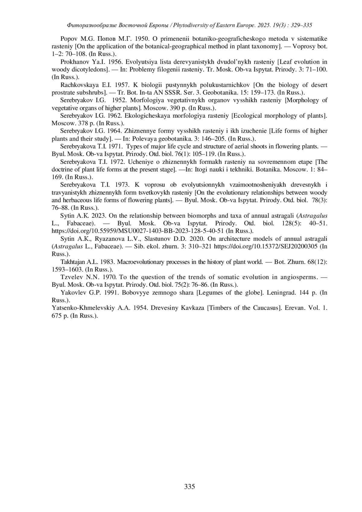 18. [Sytin et al.] Сытин А. К., Рязанова Л. В., Сластунов Д.Д. 2020. Об архитектурных моделях однолетних астрагалов (Astragalus L., Fabaceae). - Сиб. экол. журн. 3: 310-321. DOI: 10.15372/SEJ20200305