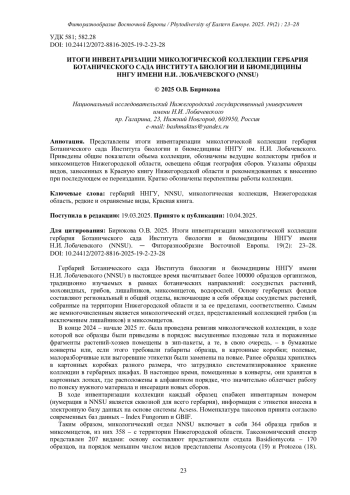 12. [Chkalov et al.] Чкалов А.В., Бирюкова О.В., Воротников В.П., Шестакова А.А., Бакка С.В., Мининзон И.Л., Соловьев А.А., Исаев С.С., Широков А.И., Аверкиев Д.Д., Гололобова И.А., Сырова В.В. 2023. Новые данные о местонахождениях видов Красной книги Нижегородской области по результатам исследований 2006-2021 гг. В кн.: Редкие виды живых организмов Нижегородской области. Вып. 6. Нижний Новгород. С. 32-38. EDN: ZDUFDK