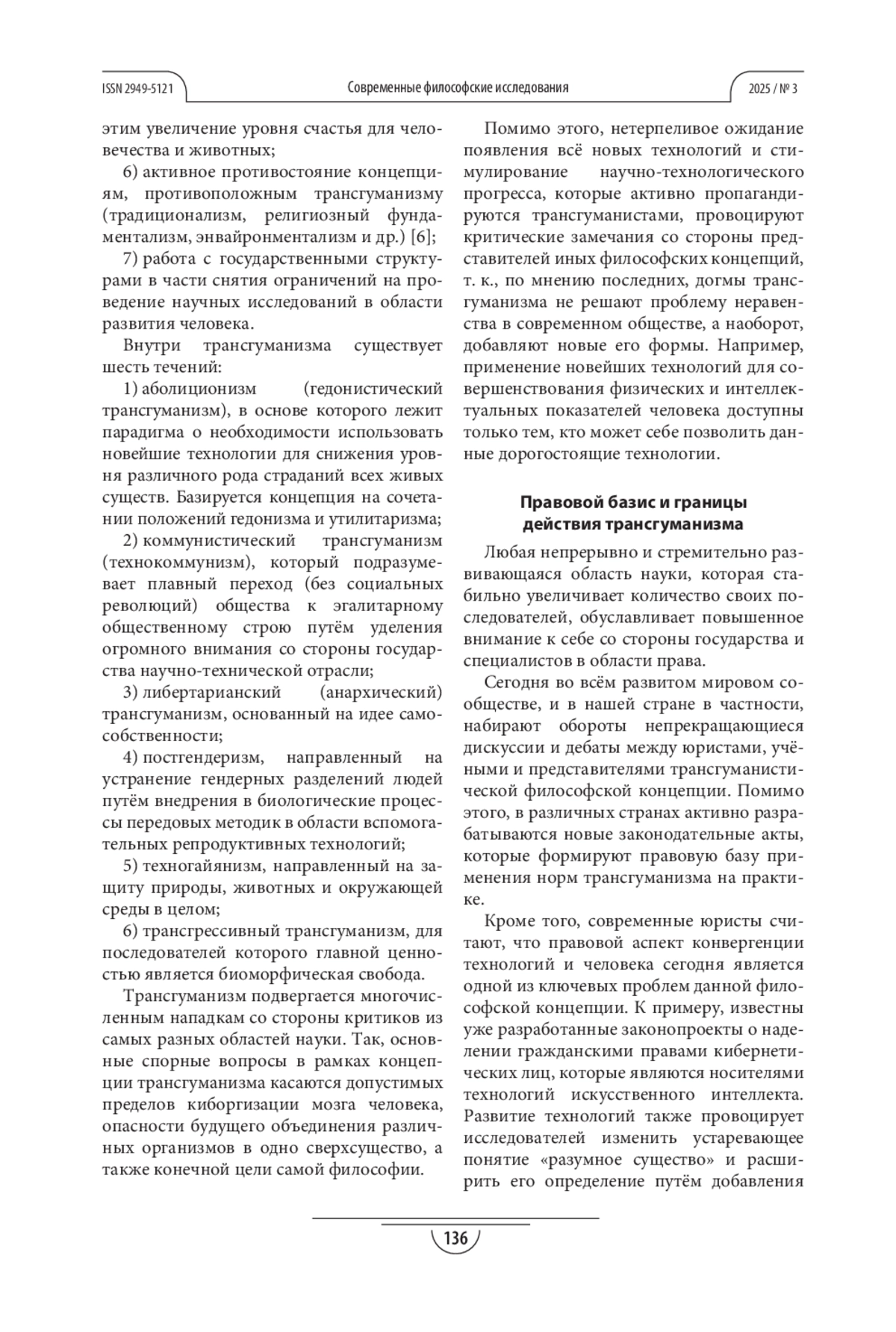 Цель. Анализ философских, правовых и этических аспектов трансгуманизма, исследование его влияния на человеческую природу и социальные процессы в контексте внедрения новых технологий, таких как генетические модификации, нанотехнологии и нейротехнологии.