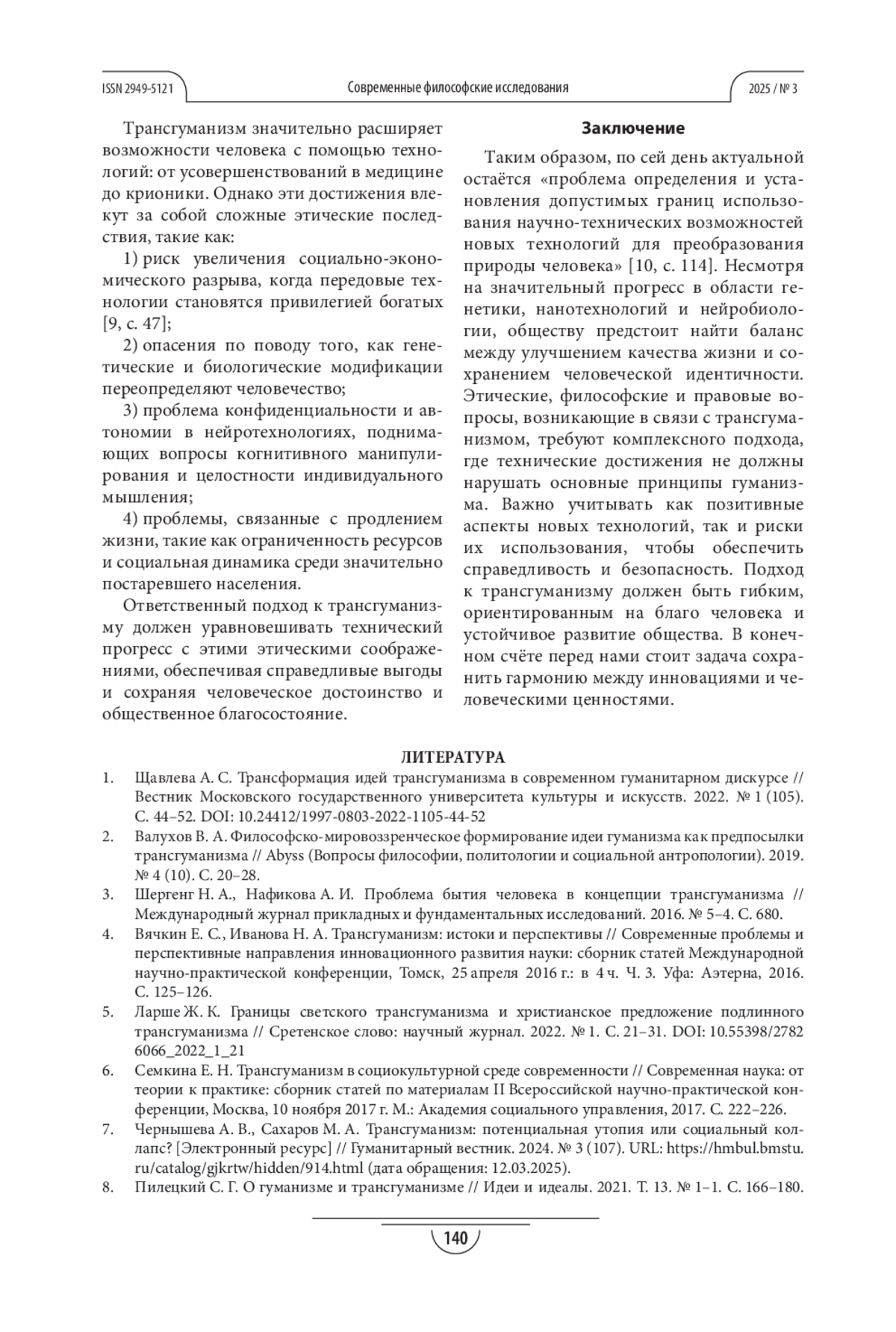 10. Черемных Л. Г., Губанов Н. Н. Умеренный и радикальный трансгуманизм // Современные философские исследования. 2023. № 3. С. 112-121. https://doi.org/10.18384/2949-5148-2023-3-112-121