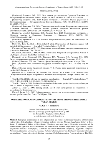 1. [Bondareva] Бондарева В.В. 2022. База данных растительности Среднего Поволжья. - Фиторазнообразие Восточной Европы. 16 (3): 5-9. DOI: 10.24412/2072-8816-2022-16-3-5-9 EDN: FTFYFH