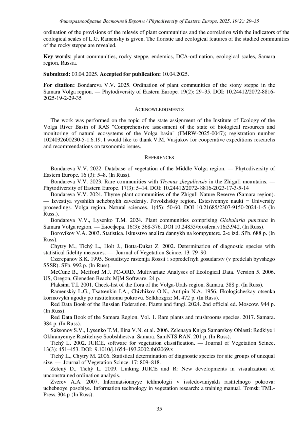 2. [Bondareva] Бондарева В.В. 2023. Редкие сообщества с участием Thymus zheguliensis в Жигулевских горах. - Фиторазнообразие Восточной Европы. 17(3): 5-14. DOI: 10.24412/2072-8816-2023-17-3-5-14 EDN: POWYBU