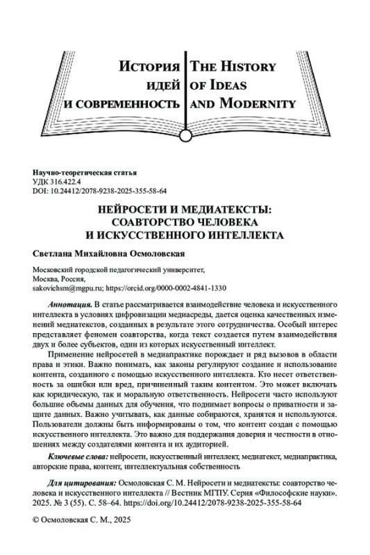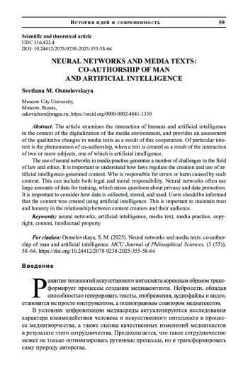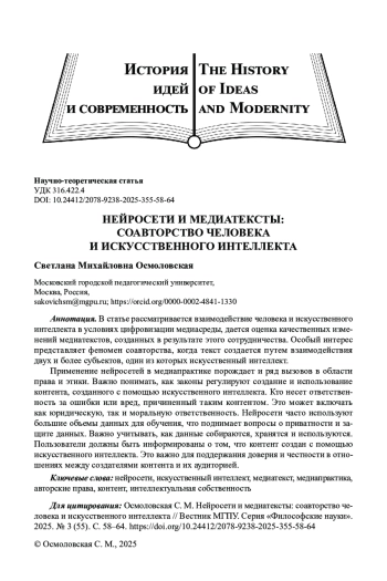 В условиях цифровизации медиасреды актуализируются исследования характера взаимодействия человека и искусственного интеллекта в процессе медиатворчества, а также оценка качественных изменений медиатекстов в результате этого сотрудничества. Предполагается, что такое сотрудничество может не только оптимизировать рутинные процессы, но и трансформировать саму природу авторства.
