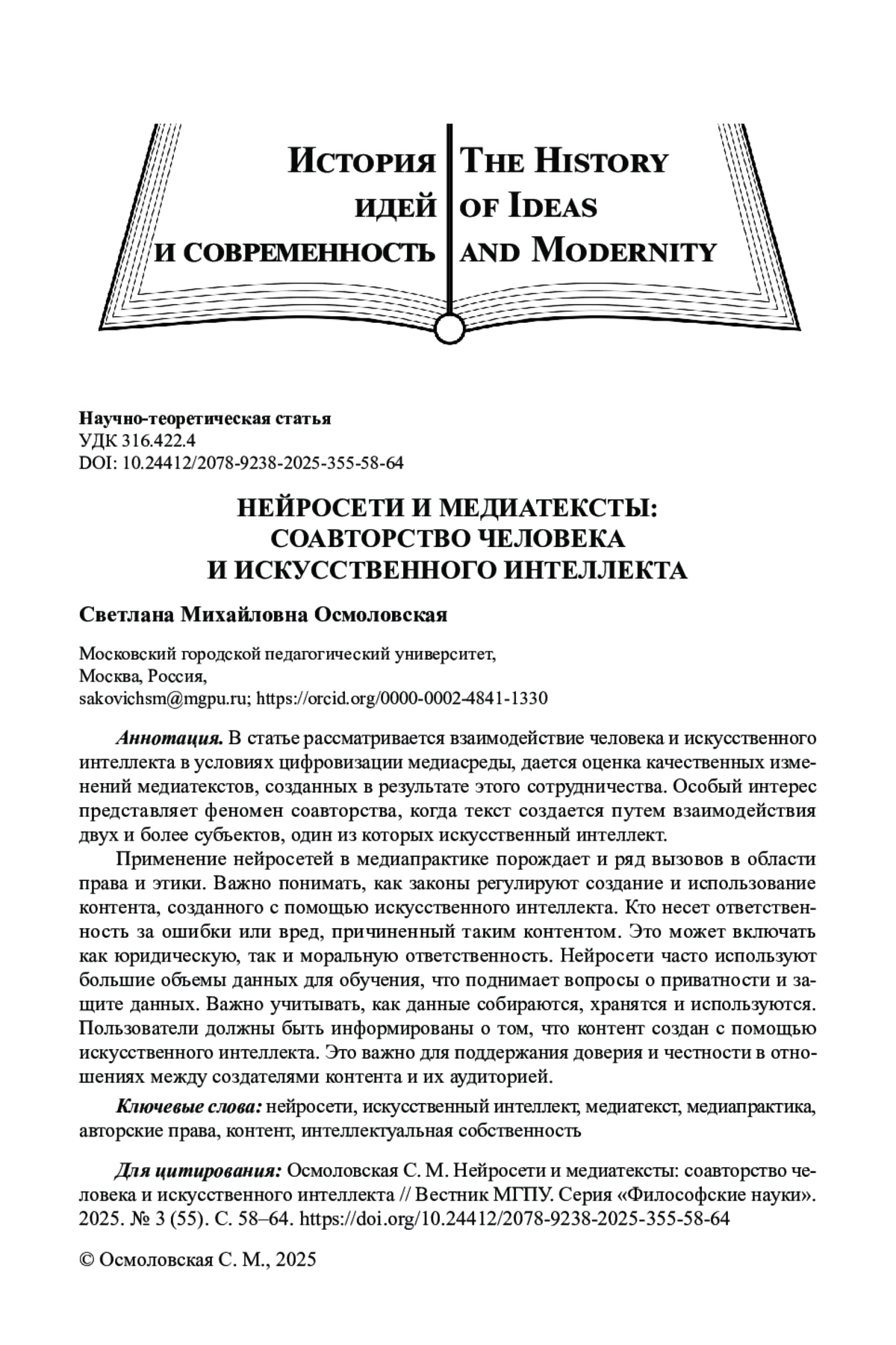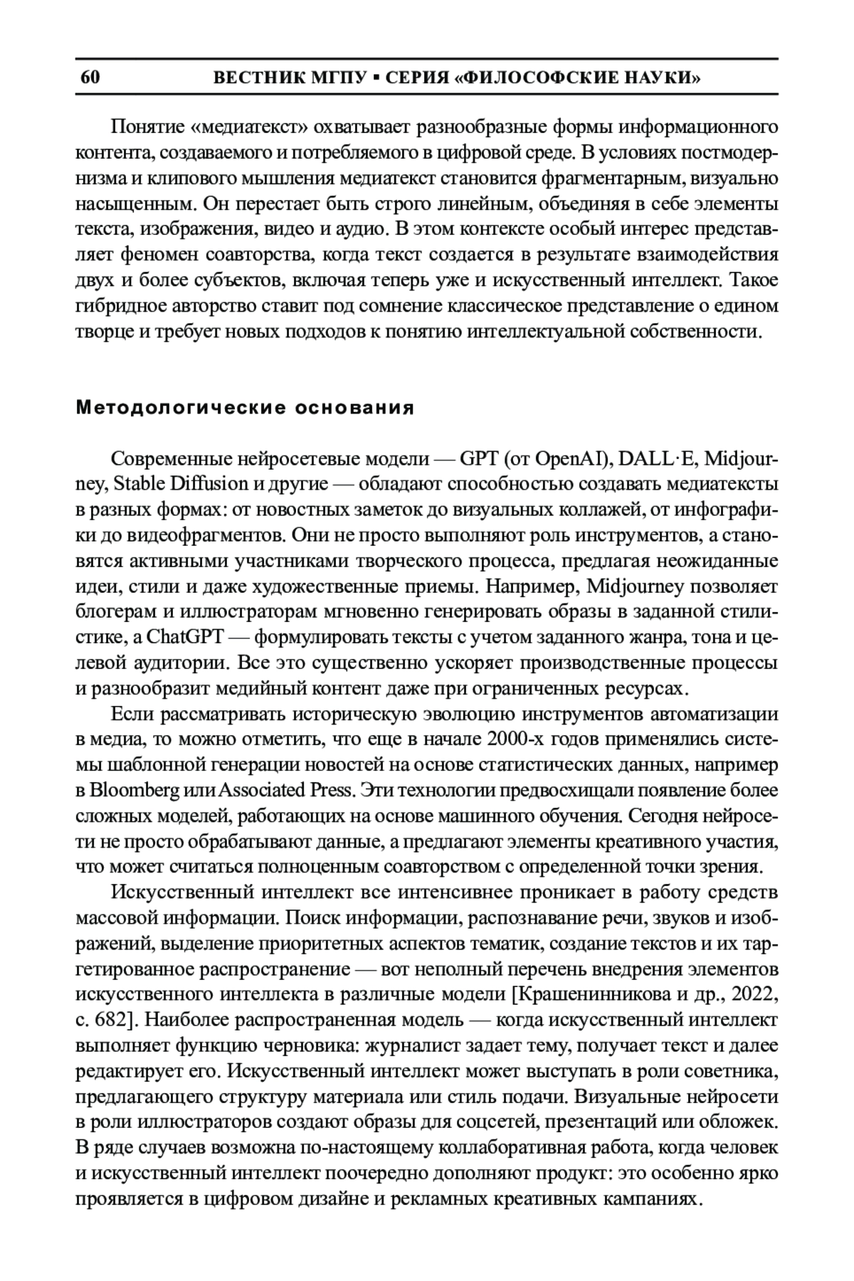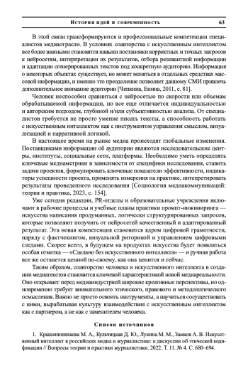 1. Крашенинникова М. А., Кульчицкая Д. Ю., Лукина М. М., Замков А. В. Искусственный интеллект в российских медиа и журналистике: к дискуссии об этической кодификации // Вопросы теории и практики журналистики. 2022. Т. 11. № 4. С. 680-694. EDN: WMNHIF