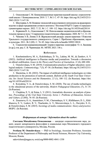 2. Осмоловская С. М. Коммуникационные практики высшей школы: социологический анализ // Коммуникология. 2019. Т. 7. № 3. С. 47-56. DOI: 10.21453/2311-3065-2019-7-3-47-56 EDN: HHFGKW