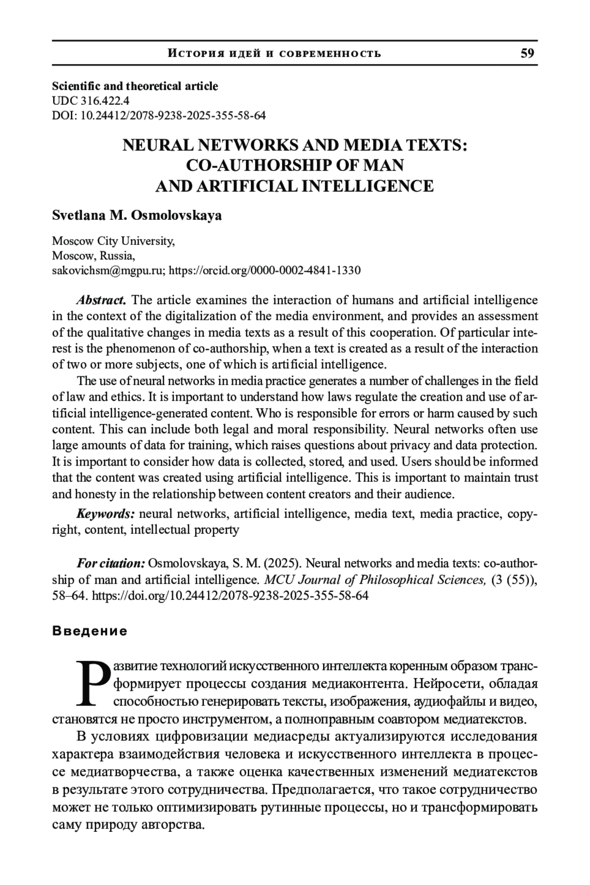 В статье рассматривается взаимодействие человека и искусственного интеллекта в условиях цифровизации медиасреды, дается оценка качественных изменений медиатекстов, созданных в результате этого сотрудничества. Особый интерес представляет феномен соавторства, когда текст создается путем взаимодействия двух и более субъектов, один из которых искусственный интеллект.