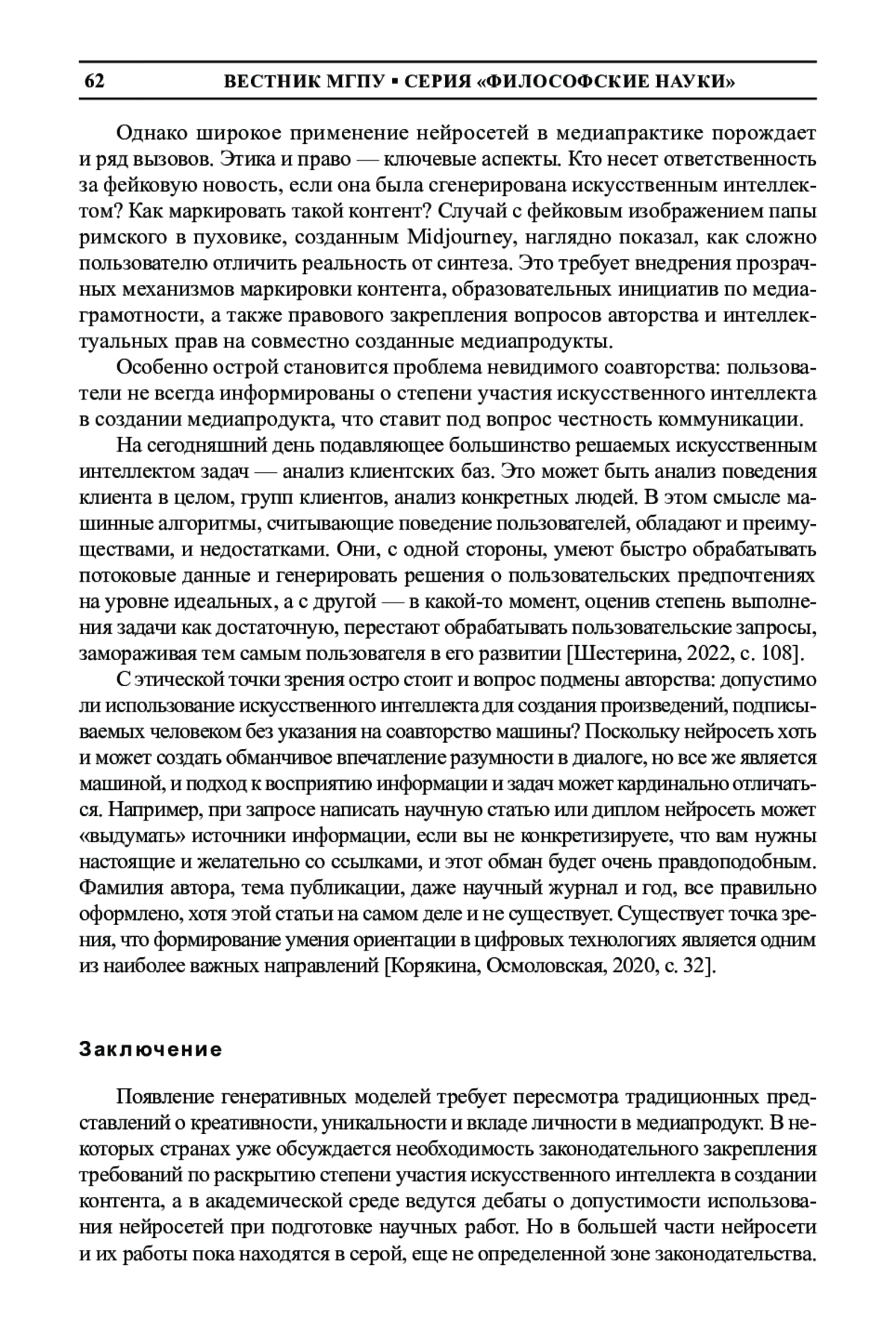 3. Шестерина А. М. Влияние технологий искусственного интеллекта на видеопроизводство в сфере продвижения сетевого контента // Вестник ЮУрГУ. Серия “Социально-гуманитарные науки”. 2022. Т. 22. № 1. С. 108-112. DOI: 10.14529/ssh220114